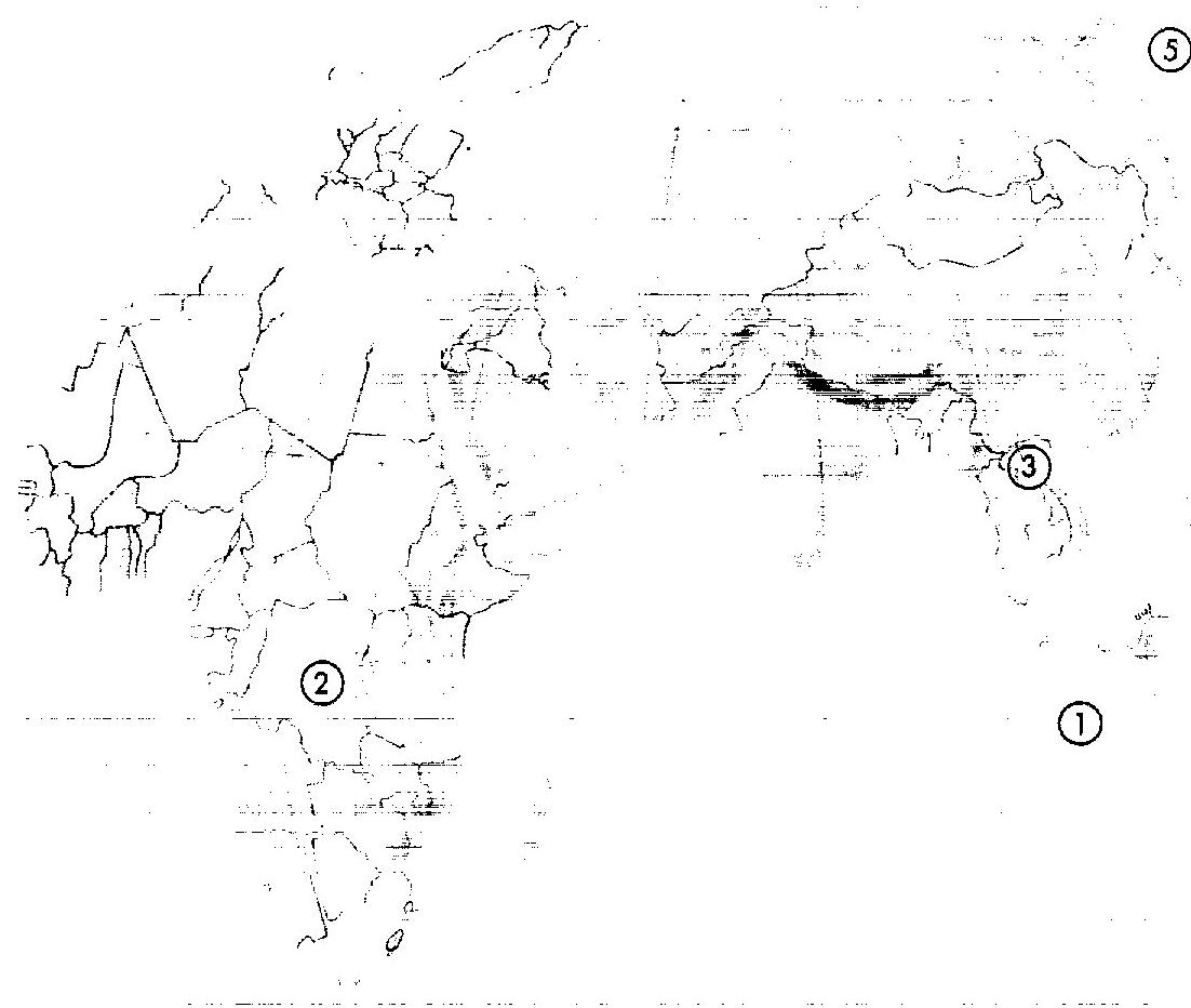 - This image is a black and white outline map of the world, primarily depicting the continents of Europe, Africa, and Asia. It is featured on [Page 3](arke:01KK2FTQFMVYA9SRG0A4WJF269) of a document dated January 14, 1961, classified as "TOP SECRET," and is part of the collection [CIA Test - March 6](arke:01KK2FMPQS3KX59D7G345X3DZD). The map contains five numbered circles, with three explicitly referenced in the accompanying text on [Page 3](arke:01KK2FTQFMVYA9SRG0A4WJF269) to highlight specific geopolitical situations: * **Circle 2** is located in Africa, corresponding to a discussion about the "Situation in the Congo." * **Circle 3** is in Southeast Asia, indicating "The situation in Laos." * **Circle 5** is in the upper right portion of the map, likely referencing the Soviet Union, in conjunction with "Soviet missile activity." Although not explicitly linked by number, the text also mentions "Indonesian President Sukarno appoints high proportion of leftists, including Communist party chairman, to executive bodies in National Front," which likely relates to **Circle 1** located in the Indian Ocean near Indonesia.