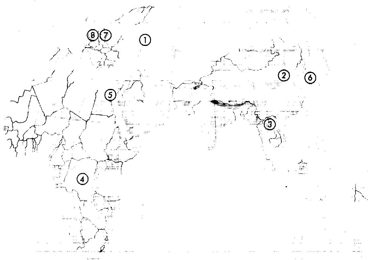 - This image is a political world map, extracted from [Page 3](arke:01KK2FTQM4S877TMBR3SA8K6MW) of the "CIA Test - March 6" collection, dated January 11, 1961. The map features eight numbered circles that correspond to specific geopolitical and economic situations detailed in the accompanying document. These points highlight key global events and regions of interest to the CIA in early 1961: * **①** Indicates the Soviet Union, referencing the upcoming Soviet Communist Party congress in October. * **②** Points to China, noting the slowdown in Communist China's industrialization pace. * **③** Locates Laos, referring to the situation in the country. * **④** Identifies the Congo, indicating the ongoing situation there. * **⑤** Marks the United Arab Republic (UAR) in the Middle East, related to its new campaign against French interests in Arab states. * **⑥** Pinpoints South Korea, concerning the growing public opinion in favor of contacts with North Korea. * **⑦** Highlights West Germany, noting its request for Allies to confirm access to East Berlin before lifting travel restrictions on East Germans. * **⑧** Indicates Belgium, referencing the expected end of strikes and the likelihood of new elections before mid-1961.