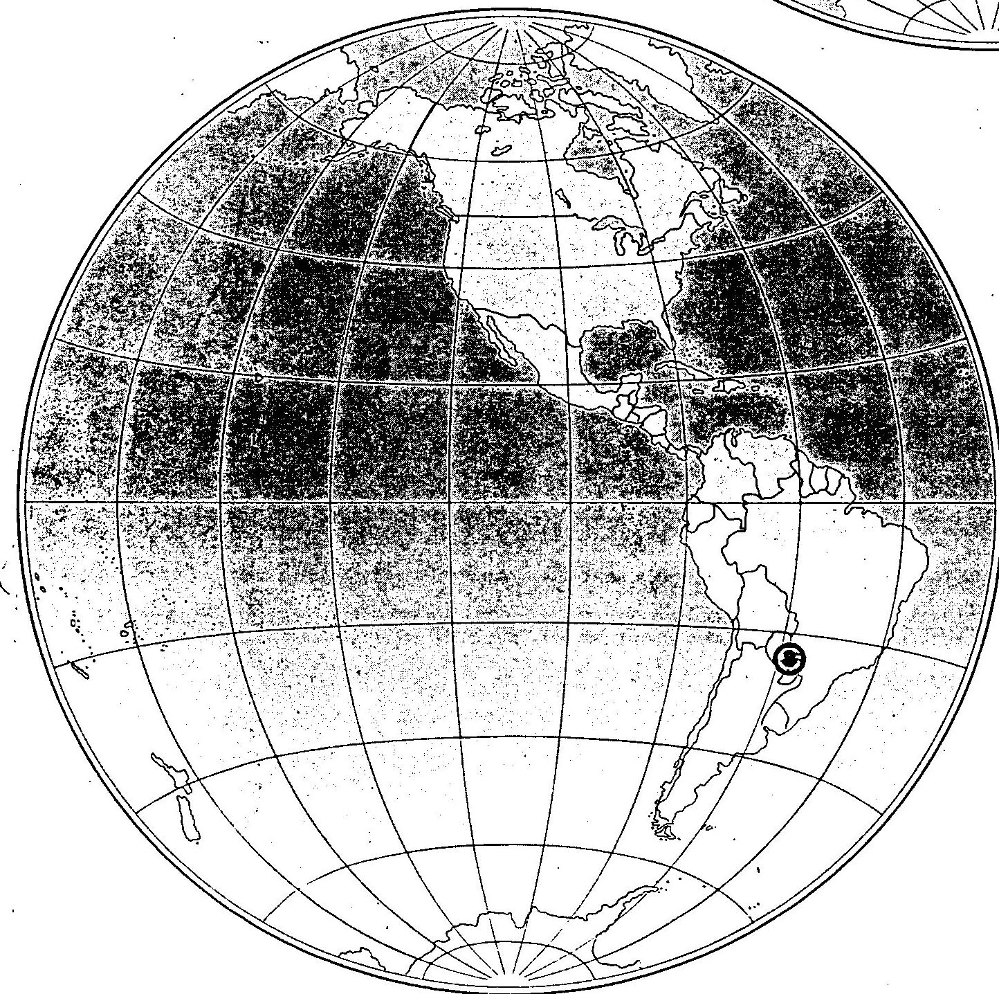 - This image is a black and white global map, primarily depicting the Western Hemisphere, including North and South America, with portions of Europe, Africa, and Antarctica also visible. The map features a grid of longitudes and latitudes. A prominent circled 'S' symbol is located in South America, specifically in the region encompassing parts of Paraguay, Brazil, and Argentina. This image was extracted from [Page 3](arke:01KK2FTPPW074TN5VTKAGTV83Y), a "TOP SECRET" document dated 6 August 1958. The surrounding text on [Page 3](arke:01KK2FTPPW074TN5VTKAGTV83Y) references "Plotting continues in Paraguay," suggesting the 'S' symbol likely indicates a location of interest related to this political activity. The image is part of the [CIA Test - March 6](arke:01KK2FMPQS3KX59D7G345X3DZD) collection.