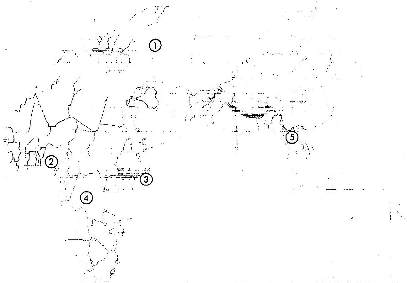 - This image is an extracted map, likely illustrating geopolitical situations detailed in a U.S. intelligence document dated January 7, 1961. The map depicts portions of Europe, Africa, and Asia, with five numbered circles highlighting specific regions. These numbered locations correspond to discussions within the document on [Page 3](arke:01KK2FTR9BKK6Z3ZMHRH5MNBC7), specifically under the "II. ASIA-AFRICA" section, and possibly the "I. THE COMMUNIST BLOC" section: * **Location 2 (West Africa):** Refers to Nigeria's severance of diplomatic relations with France. * **Location 3 (East Africa):** Relates to Somali defense officials' opposition to an Anglo-Italian military training mission, preferring UAR assistance. * **Location 4 (Central Africa):** Highlights the situation in the Congo. * **Location 5 (Southeast Asia):** Indicates the situation in Laos. * **Location 1 (Europe/Russia):** While not explicitly numbered in the text's corresponding section, this location likely pertains to the broader context of the Communist Bloc, where Khrushchev reportedly cited the need to establish contact with the new U.S. administration as a reason for postponing the Soviet party congress. The image is part of the larger collection, [CIA Test - March 6](arke:01KK2FMPQS3KX59D7G345X3DZD), suggesting its origin in intelligence reporting.