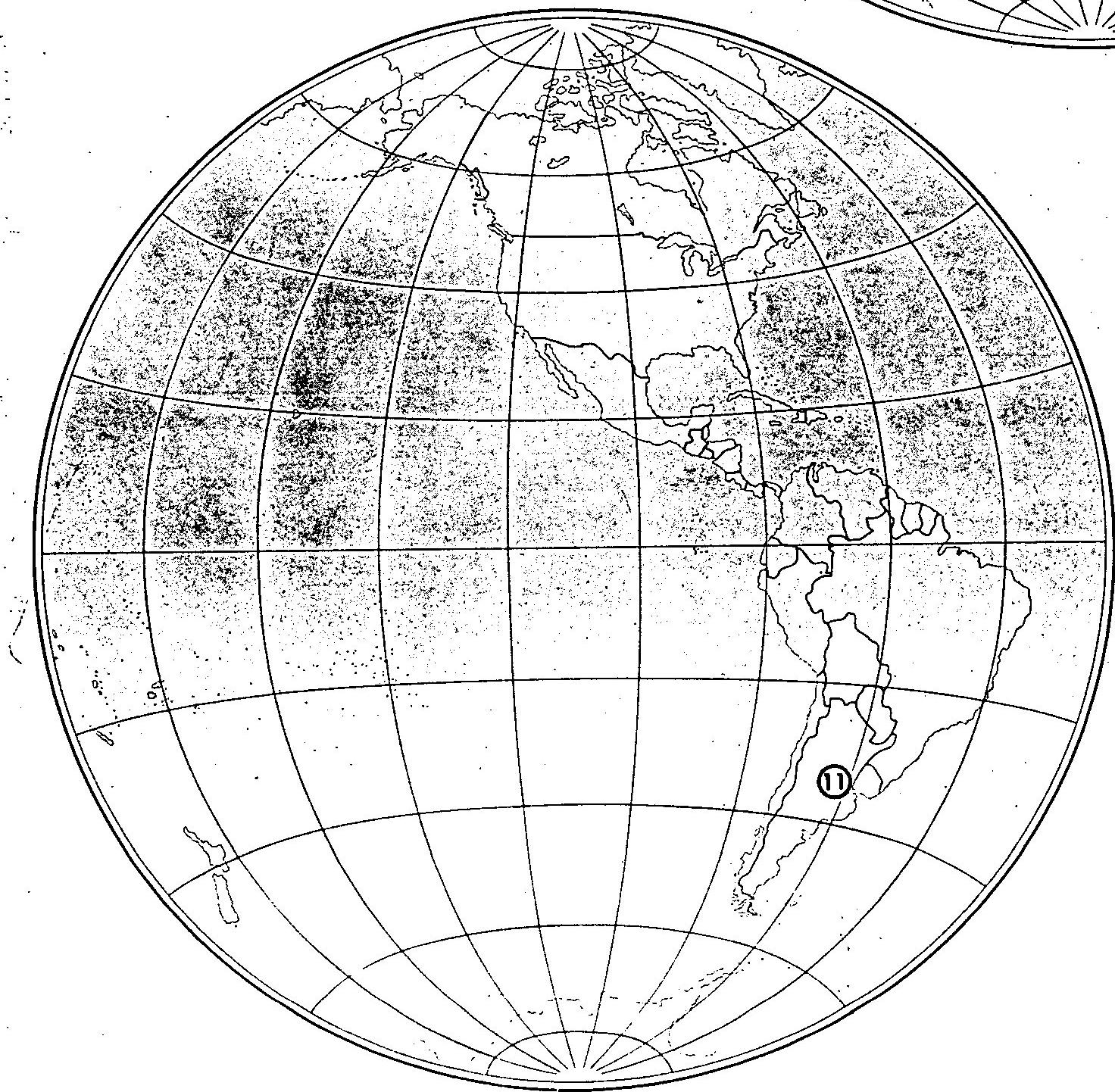 - This black and white image depicts a global map, primarily focused on the Western Hemisphere, showing continents, oceans, and a grid of latitude and longitude lines. A prominent circled number '11' is placed over Argentina in South America. The image was extracted from [Page 3](arke:01KK2FTQGJPKPQQEWKRY92V3XH), a document dated November 12, 1958, and classified 'SECRET'. The circled '11' corresponds to item '11 Argentina - President imposes state of siege as result of strike by oil workers.' within the 'III. THE WEST' section of the document, indicating that the map serves as a geographical reference for the reported political event. This file is part of the [CIA Test - March 6](arke:01KK2FMPQS3KX59D7G345X3DZD) collection.