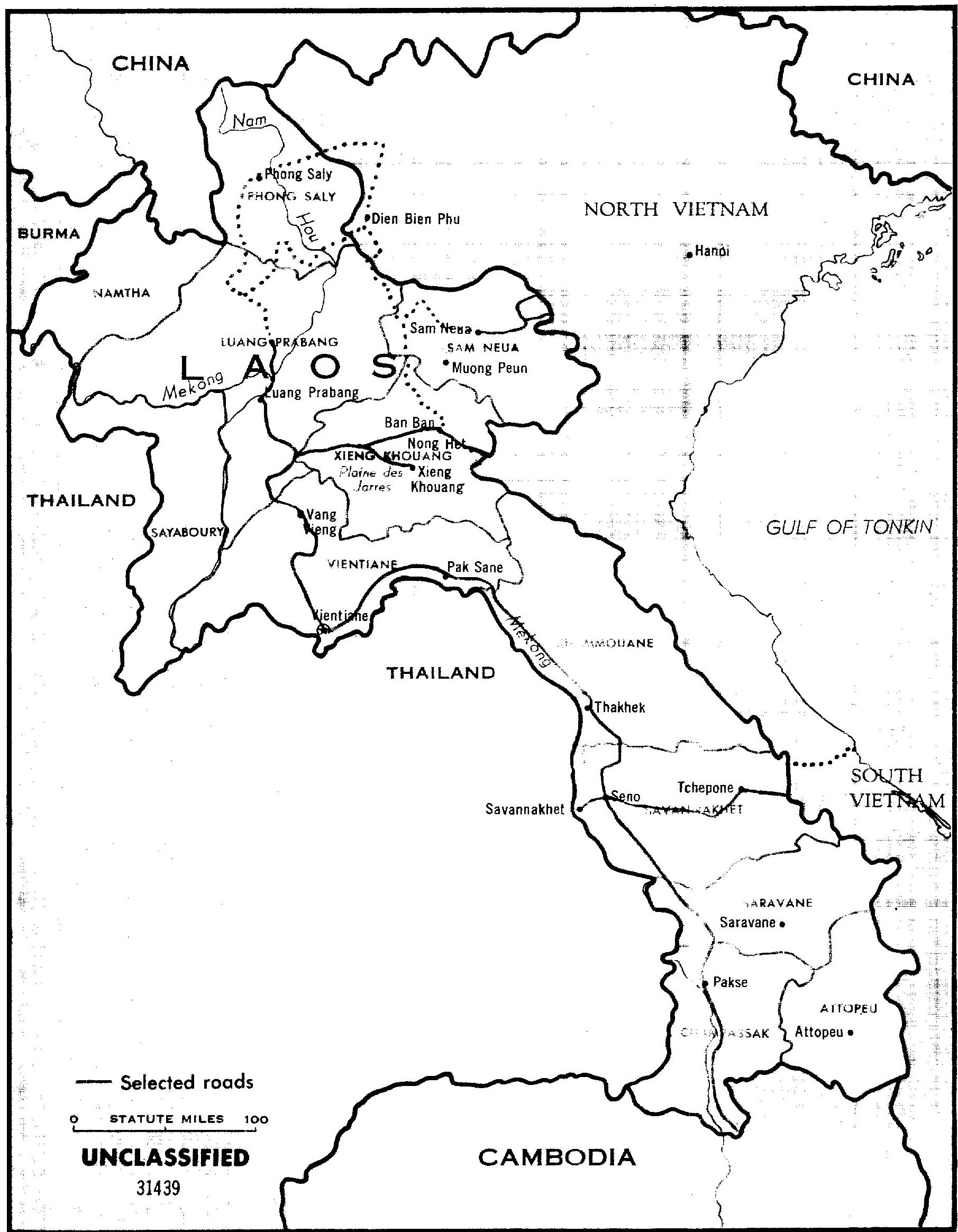 - This image is a map of Laos and its geopolitical context in Southeast Asia, featuring its borders with China, Burma (Myanmar), Thailand, Cambodia, North Vietnam, and South Vietnam. The map details numerous cities and regions within Laos, including Phong Saly, Luang Prabang, Namtha, Vientiane (the capital), Pak Sane, Thakhek, Savannakhet, Seno, Tchepone, Saravane, Pakse, Attopeu, Xieng Khouang (Plaine des Jarres), Sam Neua, Muong Peun, Ban Ban, Nong Het, and Vang Vieng. Key geographical features like the Mekong and Hou rivers are prominently displayed. Neighboring locations such as Dien Bien Phu and Hanoi in North Vietnam, and the Gulf of Tonkin, are also indicated. The map highlights "selected roads" with thick lines and includes a scale bar representing 0 to 100 statute miles. It is marked "UNCLASSIFIED" and has the identification number 31439. The presence of both North and South Vietnam suggests the map was produced prior to Vietnam's reunification in 1975. This map was extracted from [Page 13](arke:01KK2FTRASQH5W7XVB9P3Y0F91) and is part of the [CIA Test - March 6](arke:01KK2FMPQS3KX59D7G345X3DZD) collection, indicating its potential use in intelligence or strategic analysis during that period.