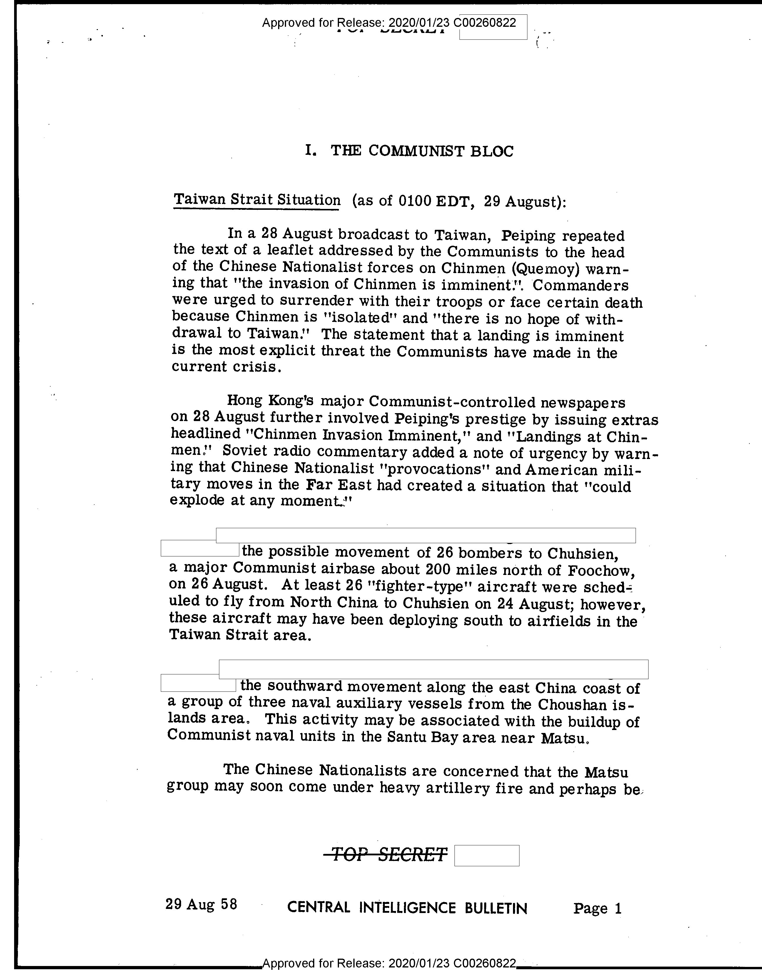 - Approved for Release: 2020/01/23 C00260822 # I. THE COMMUNIST BLOC Taiwan Strait Situation (as of 0100 EDT, 29 August): In a 28 August broadcast to Taiwan, Peiping repeated the text of a leaflet addressed by the Communists to the head of the Chinese Nationalist forces on Chinmen (Quemoy) warning that "the invasion of Chinmen is imminent". Commanders were urged to surrender with their troops or face certain death because Chinmen is "isolated" and "there is no hope of withdrawal to Taiwan." The statement that a landing is imminent is the most explicit threat the Communists have made in the current crisis. Hong Kong's major Communist-controlled newspapers on 28 August further involved Peiping's prestige by issuing extras headlined "Chinmen Invasion Imminent," and "Landings at Chinmen." Soviet radio commentary added a note of urgency by warning that Chinese Nationalist "provocations" and American military moves in the Far East had created a situation that "could explode at any moment." the possible movement of 26 bombers to Chuhsien, a major Communist airbase about 200 miles north of Foochow, on 26 August. At least 26 "fighter-type" aircraft were scheduled to fly from North China to Chuhsien on 24 August; however, these aircraft may have been deploying south to airfields in the Taiwan Strait area. the southward movement along the east China coast of a group of three naval auxiliary vessels from the Choushan islands area. This activity may be associated with the buildup of Communist naval units in the Santu Bay area near Matsu. The Chinese Nationalists are concerned that the Matsu group may soon come under heavy artillery fire and perhaps be TOP SECRET 29 Aug 58 CENTRAL INTELLIGENCE BULLETIN Page 1 Approved for Release: 2020/01/23 C00260822