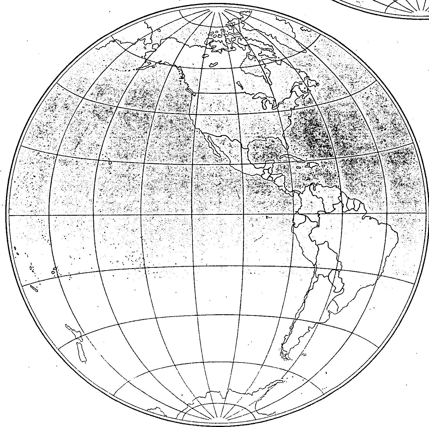 - This image displays a black and white globe map, primarily centered on the continents of North and South America. The map features outlines of landmasses, including North America, Central America, and South America, as well as visible portions of Europe, Africa, and Oceania. A grid of latitude and longitude lines is overlaid on the globe. Some land areas are shaded with a stippling pattern, potentially indicating a specific region or data overlay. The image was extracted from [Page 3](arke:01KK9H0ZYPJPEWS69E34CQAHHV), a document dated August 29, 1958, which appears to be an intelligence or political report. This image is part of the collection [Fresh KG Test - Big Text](arke:01KK9GC2HCCJ5C5B9Y1WVVFXQT).