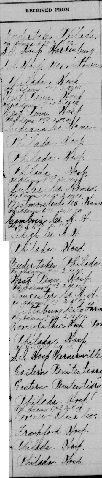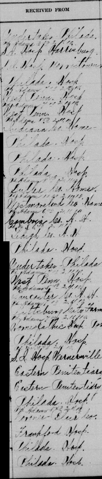 - RECEIVED FROM Cudr. Take. - Philada. Ph. Adams 3/23/10 S.A. Hosp Harrisburg. L.A. Hosp Morristown Philada. Hosp Ph. Adams 1/23 2.10.10 Hosp Penn. Hosp Ph. Adams 1/23 2.10.10 Hosp Penn. Hosp Ph. Adams 1/23 2.10.10 Indiana Co. Home- Philada. Hosp Philada. Hosp Philada. Hosp Ph. Adams 8/10 12.11.10 Butler Co. Home. Ph. Adams 11/23 2.11.10 Westmoreland Co. Home Ph. Adams 6/10 2.11.10 Cambria Co. A. H. Ph. A. S. 6/10 2.11.10 Lehigh Co. A. H. Philada. Hosp. Cudertaker - Philada Ph. Adams 1/10 2.11.10 Hosp Penn. Hosp. Ph. Adams 1/10 2.11.10 Lancaster Co. A. H. Ph. Adams 1/10 2.11.10 Pittsburg City Farm Ph. Adams 7/24 2.11.10 Home Catholic Hosp. Post Philada. Hosp F. Hall 2/23 2.11.10 S.A. Hosp Wernerville Eastern Penitentiary Eastern Penitentiary Philada. Hosp Ph. Adams 5/23 2.11.10 Coroner - Elur Co. Frankford Hosp. Philada. Hosp. Philada. Hosp.