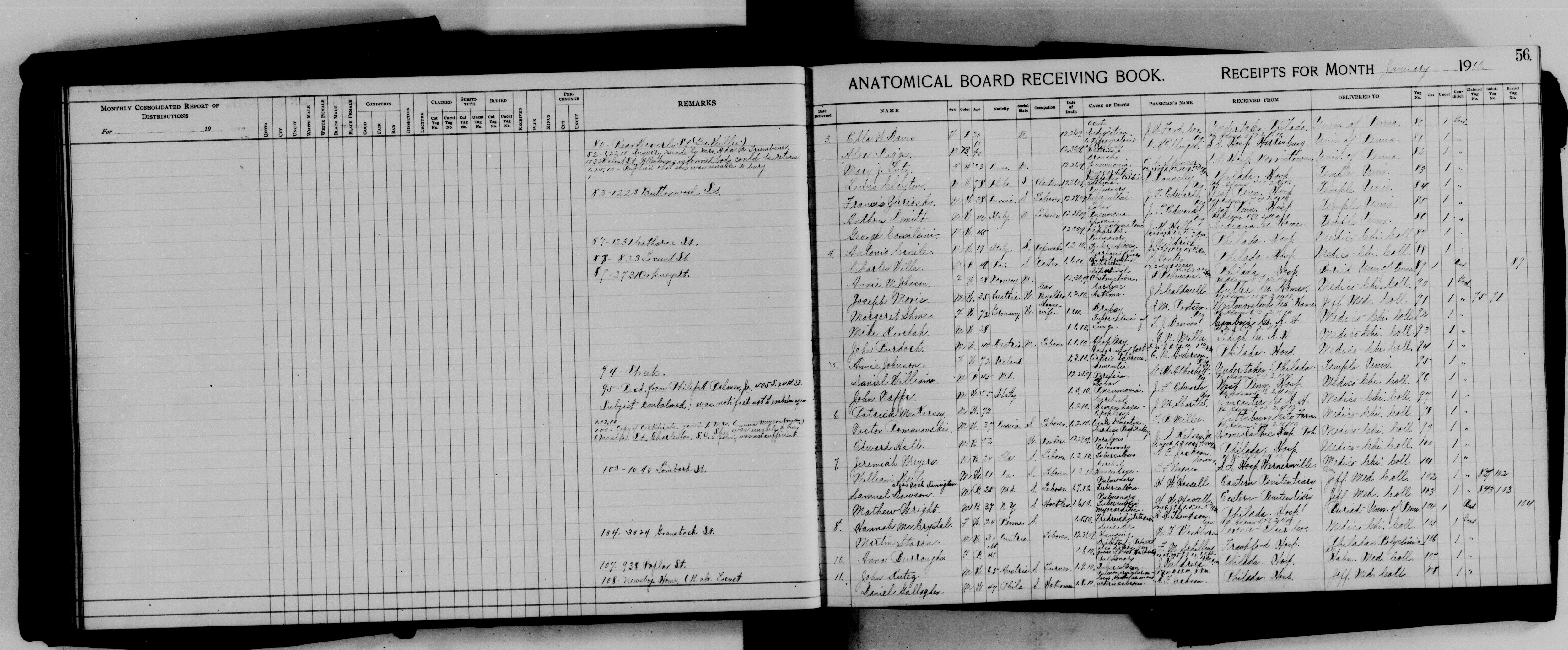 - 56 # ANATOMICAL BOARD RECEIVING BOOK. ## RECEIPTS FOR MONTH January 1900 | Date | NAME | PLACE | SUBJECT | DATE OF ENTRY | DATE OF ENTRY | NAME OF BONOR | BONOR UNIT | BONOR UNIT | REMARKS | | --- | --- | --- | --- | --- | --- | --- | --- | --- | --- | | 1 | Ellis Robane | N. 110 | R. | 1900 | R. 1900 | R. 1900 | R. 1900 | R. 1900 | R. 1900 | | | Lino Rizzi | N. 110 | R. | 1900 | R. 1900 | R. 1900 | R. 1900 | R. 1900 | R. 1900 | | | Mary Pettis | N. 117 | R. 1900 | 1900 | 1900 | R. 1900 | R. 1900 | R. 1900 | R. 1900 | | | Louise Carestine | N. 117 | R. 1900 | 1900 | 1900 | R. 1900 | R. 1900 | R. 1900 | R. 1900 | | | Frances Perrenola | N. 117 | R. 1900 | 1900 | 1900 | R. 1900 | R. 1900 | R. 1900 | R. 1900 | | | Sallina Rosetti | N. 117 | R. 1900 | 1900 | 1900 | R. 1900 | R. 1900 | R. 1900 | R. 1900 | | | Briggs Annabella | N. 110 | R. | 1900 | R. 1900 | R. 1900 | R. 1900 | R. 1900 | R. 1900 | | 2 | Antonio Barriola | N. 110 | R. 1900 | 1900 | 1900 | R. 1900 | R. 1900 | R. 1900 | R. 1900 | | | Lorraine Balsara | N. 110 | R. 1900 | 1900 | 1900 | R. 1900 | R. 1900 | R. 1900 | R. 1900 | | | Lorraine Balsara | N. 110 | R. 1900 | 1900 | 1900 | R. 1900 | R. 1900 | R. 1900 | R. 1900 | | 3 | Joseph Moore | N. 110 | R. 1900 | 1900 | 1900 | R. 1900 | R. 1900 | R. 1900 | R. 1900 | | | Joseph Moore | N. 110 | R. 1900 | 1900 | 1900 | R. 1900 | R. 1900 | R. 1900 | R. 1900 | | | Joseph Moore | N. 110 | R. 1900 | 1900 | 1900 | R. 1900 | R. 1900 | R. 1900 | R. 1900 | 94 blank 95: Redfield (Ralph) Balam, Jr. 1900-1901 Request re-declared - over and first set to exchange 1900 Re-accepted and 2900 - same amount of Receivable to R. 1900-1901, $10.00 in amount of amount 1900-1901 S. S. S. S. S. S. 194 1900 S. S. S. S. 194 1900 S. S. S. 197 738 194 S. S. S. 198 2000 S. S. S. S. 199 738 194 S. S. S.