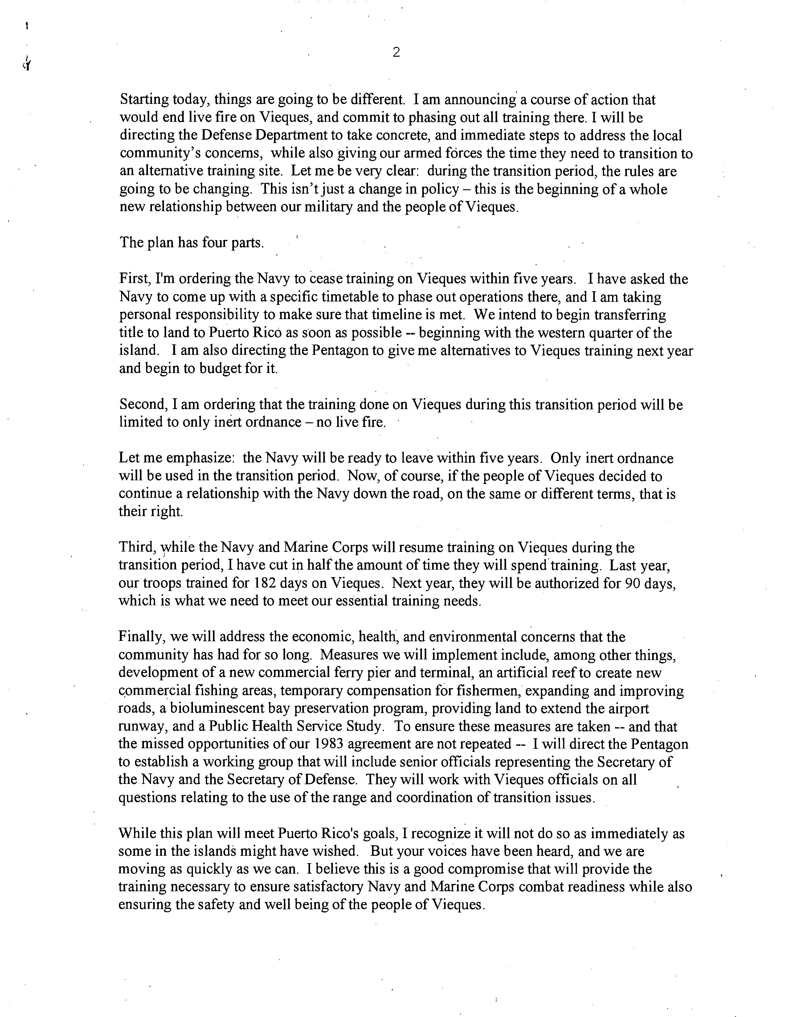 First, I'm ordering the Navy to cease training on Vieques within five years. I have asked the Navy to come up with a specific timetable to phase out operations there, and I am taking personal responsibility to make sure that timeline is met. We intend to begin transferring title to land to Puerto Rico as soon as possible -- beginning with the western quarter of the island. I am also directing the Pentagon to give me alternatives to Vieques training next year and begin to budget for it.