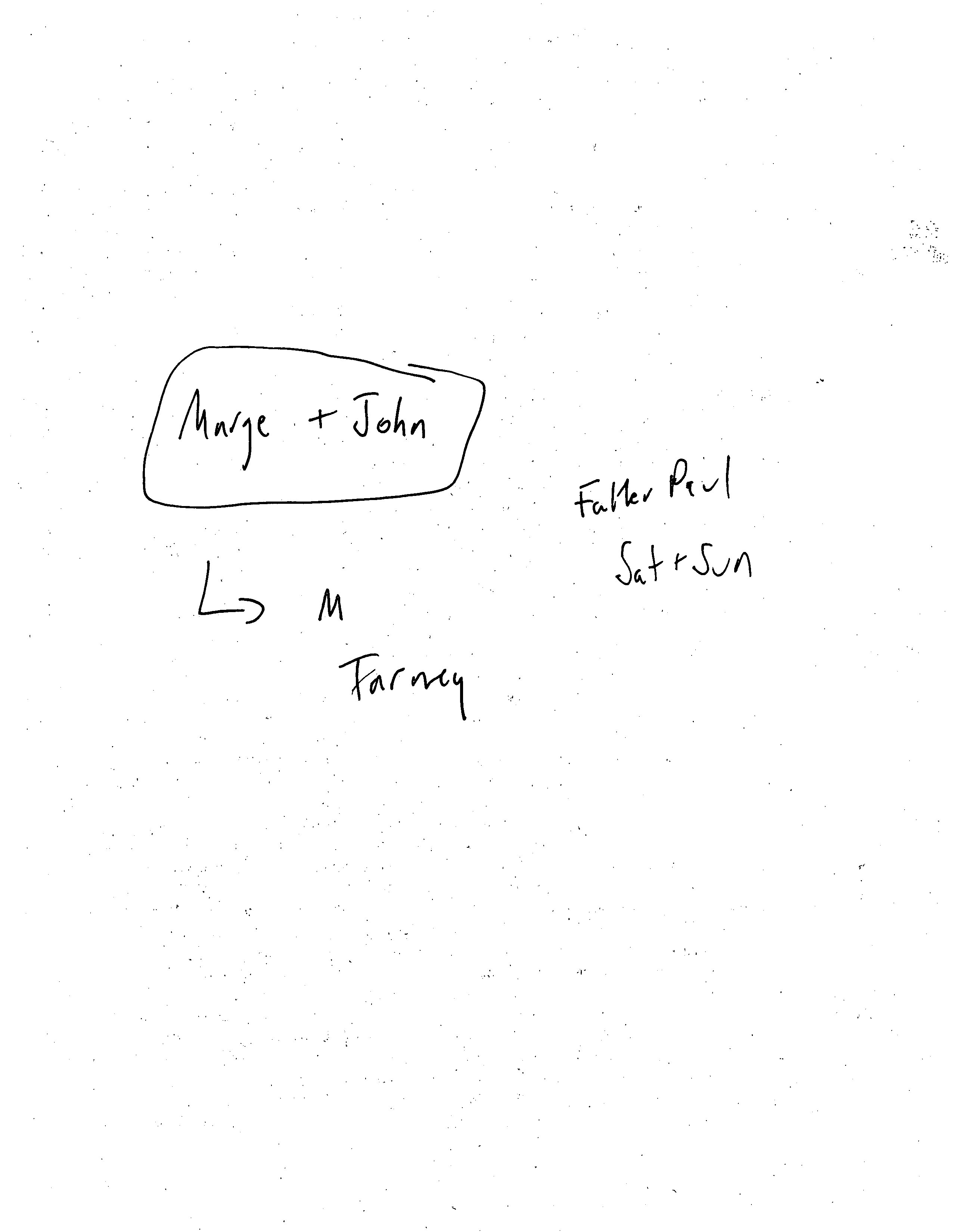 - Marge + John L → M Farney Father Paul Sat + Sun