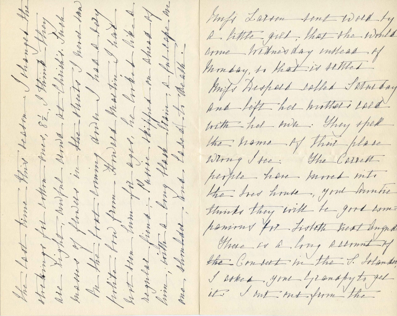 @alice_austen -> mentioned in -> @letter_1892_04_20 {context: "ticket sent to Miss Cousin Dolla"}The last time this season I changed the stockings for Esther—April 8th, I think they are right, wonderful thread at Christ's. Such matters of flunkey in the streets I never saw. In the first coming down I had a very polite (now from Howard Martin) I had kept him from for ages, he looks & likes a regnat friend; Pattere whipped on ahead of him, with a long flask, wine; a fat hope. An one, shrubbed, bad, to see if to death. Miss Larson lent word by a little girl, that the world came Wednesday instead of Monday, so that is settled. Miss Despard called Saturday and left her brother's card with her milk. They spell the name by their please wrong I see. The correct people have moved into the red house, your Auntie thinks they will be good companions for Lisbeth Great Angels. There is a long account of the Concert in the S. Islander, I ask you Grandpa to get it. I cut out from the