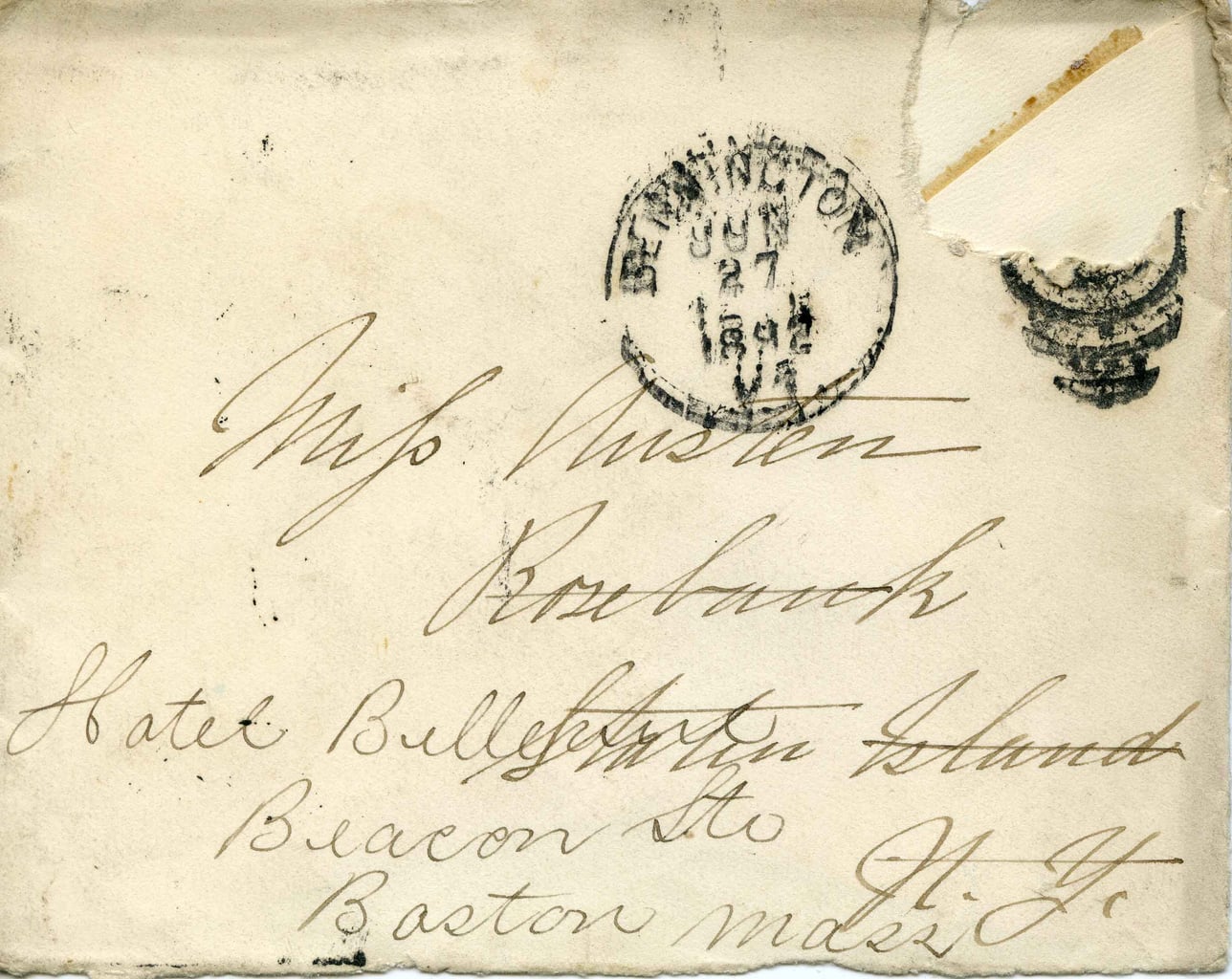 Miss Weston Rosebank Hotel Bulletham Island Beacon St. Boston Mass.