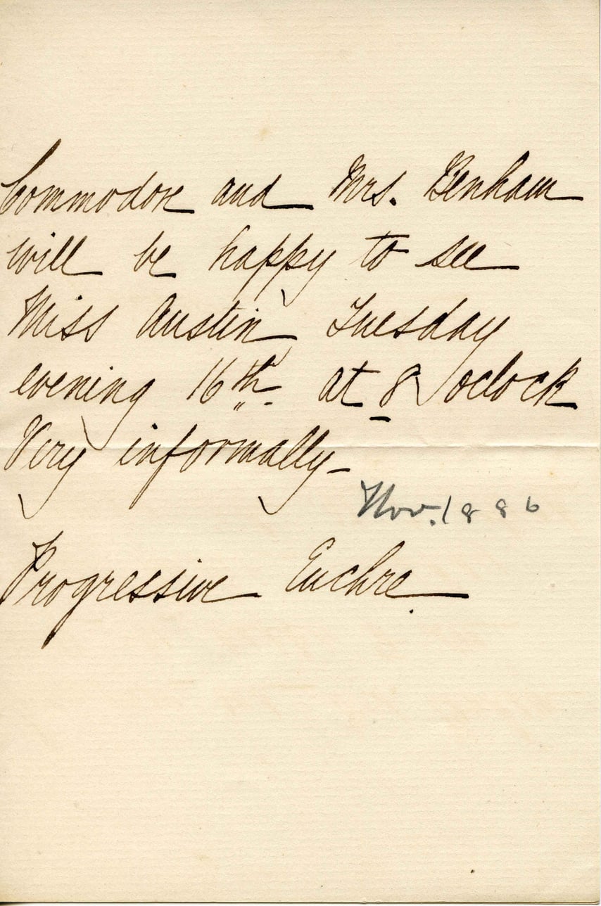 @date_1887_01_06Commodore and Mrs. Engham will be happy to see Miss Austin Tuesday evening 16th at 8 o'clock very informally. Progressive Ladies Nov. 1896