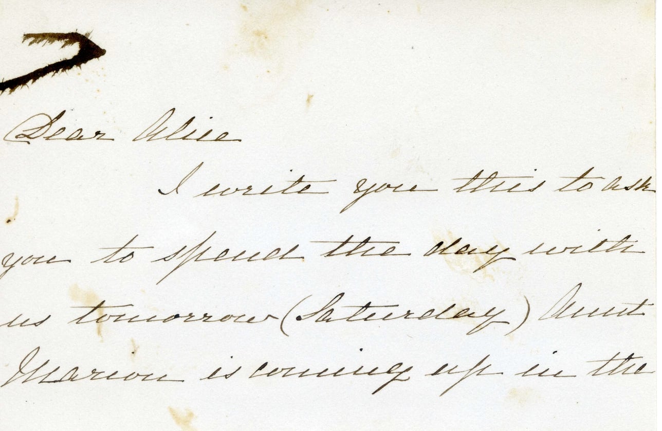 @letter_kitty_mcandrew_1886_undated001:document {author: @kitty_mcandrew, recipient: @alice_austen, type: "personal invitation", content: "Ask Alice to spend the day with us tomorrow (Saturday) as Aunt Marrow is coming up"}
