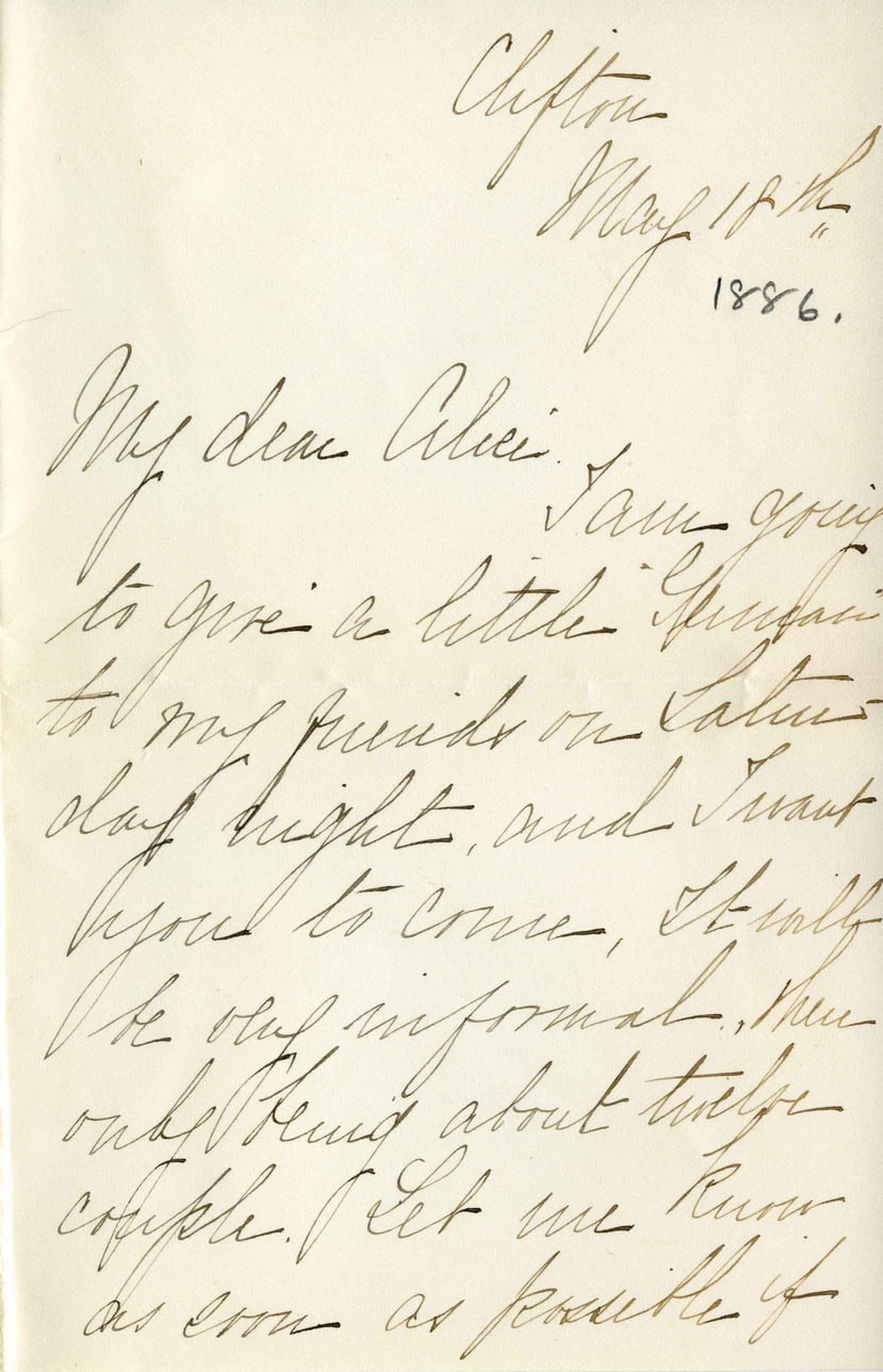 Clifton May 12th 1886. My dear Alice, I am going to give a little farewell to my friends on Saturday night, and I want you to come. It will be very informal, then only talking about the couple. Let me know as soon as possible if