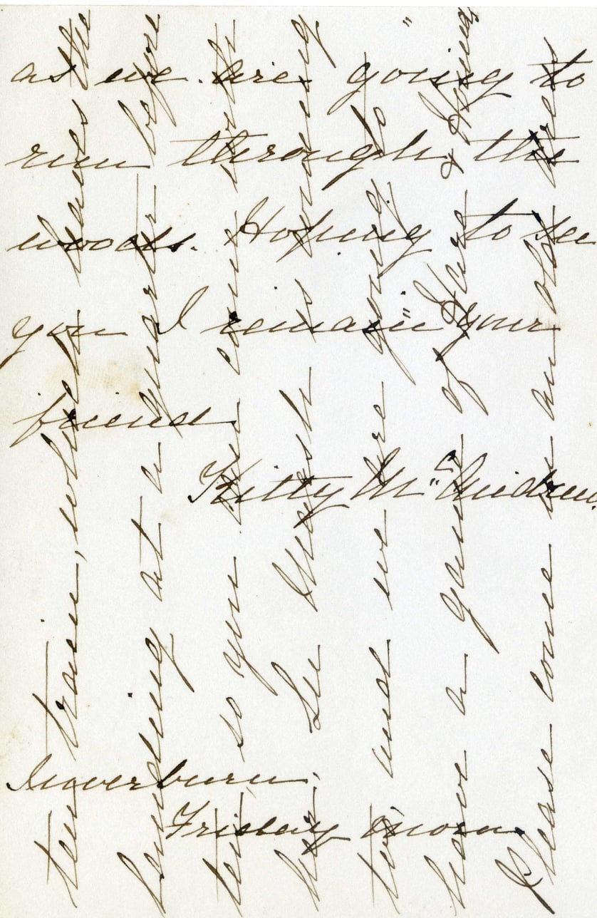 @letter_kitty_mcandrew_1886_undated002:document {author: @kitty_mcandrew, recipients: [@betty_mcquicken, @frisley_jones], type: "invitation", content: "Run through the woods"}