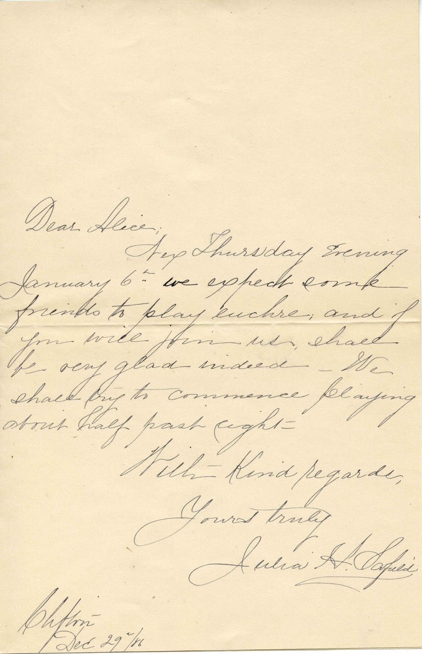 Dear Alice, Any Thursday Evening January 6th we expect some friends to play euchre, and if you will join us, shall be very glad indeed. We shall propose to commence playing about half past eight. With Kind regards, Yours truly, Laura H. Capri Chilton Dec 29th