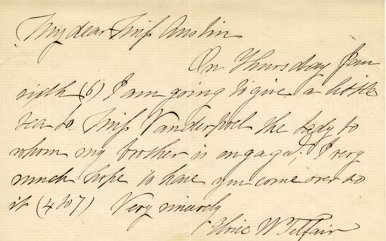My dear Trip Cousin, On Thursday June eight (6) I am going to give a little tea to Miss Vanderphul the lady to whom my brother is engaged; I very much hope to have you come over to it (407). Very sincerely, Alice W. Tolfair