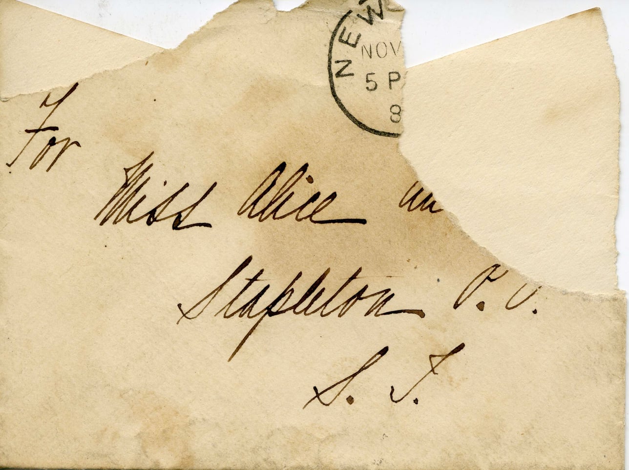 @letter_nov_unknown_1886:document {date: @date_1886_11, recipient: @alice_austen, location: @staten_island, ocr_text: "For Miss Alice in Stapleton, P.V.\nS.J.A.", note: "unknown sender"}