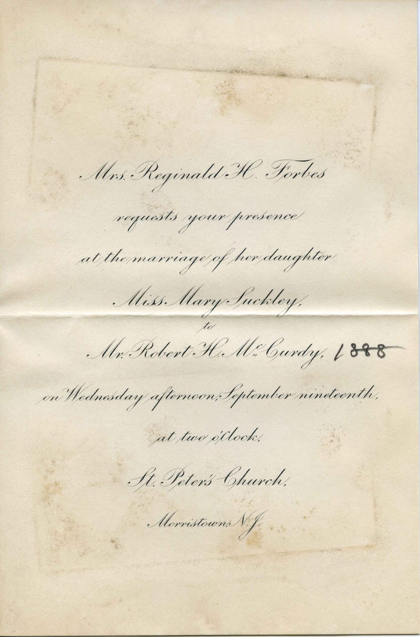 @wedding_invitation -> scheduled for -> @date_1888_09_19Mrs. Reginald H. Forbes requests your presence at the marriage of her daughter Miss Mary Suckley, to Mr. Robert H. McCurdy, 1888 on Wednesday afternoon, September nineteenth, at two o'clock. St. Peter's Church, Morristown, N.J.