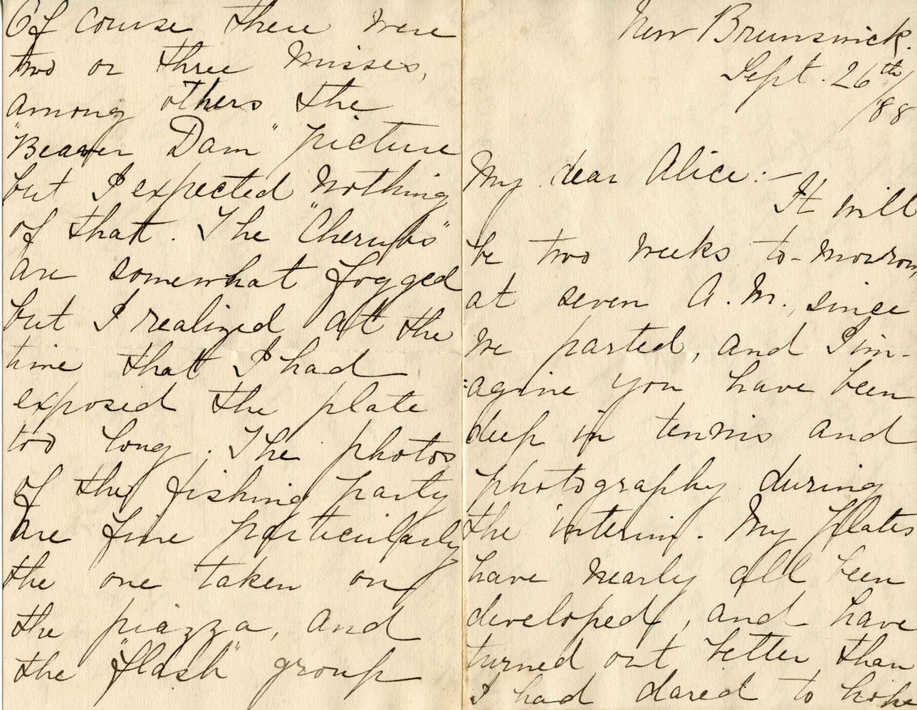 @letter_1005 -> mentions -> @colorado_springsOf course there were two or three others, among them the "Beaver Dam" picture but I expected nothing of that. The "Cherubs" are somewhat fogged but I realized at the time that I had exposed the plate too long. The photos of the fishing party are fine particularly the one taken on the pizza, and the "Fish" group. New Brunswick Sept. 26th 1888 My dear Alice:—It will be two weeks tomorrow at seven A.M. since we parted, and I imagine you have been keep up tennis and photography during the interval. My plates have nearly all been developed, and have turned out better than I had dared to hope.