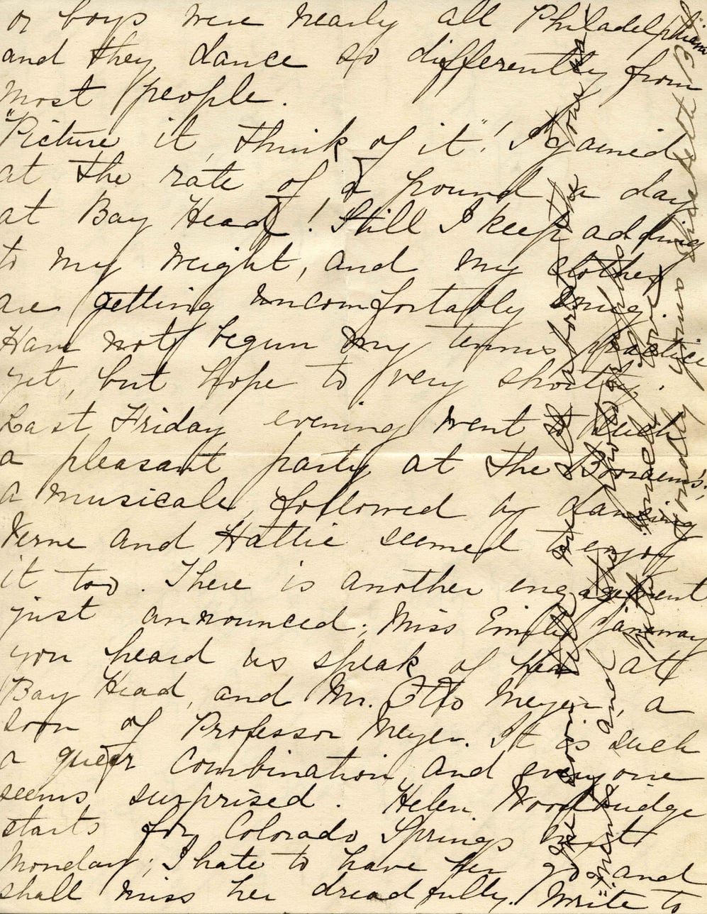 or boys were nearly all Philadelphians and they dance so differently from most people. "Picture it, think of it," I cried at the rate of 4 round a day at Bay Head! Still I keep adding to my weight, and my clothes are getting uncomfortably紧身. Have not begun my lessons yet, but hope to very shortly. Last Friday evening went to Miss B's a pleasant party at The Bramins'. A musical followed by dancing. Irene and Hattie seemed to enjoy it too. There is another engagement just announced; Miss Emily you heard us speak at Bay Head, and Mr. Otto Meyer, a son of Professor Meyer. It is such a queer combination and everyone seems surprised. Helen Woodbridge starts for Colorado Springs by it Monday; I hate to have her go and shall miss her dreadfully. Write to
