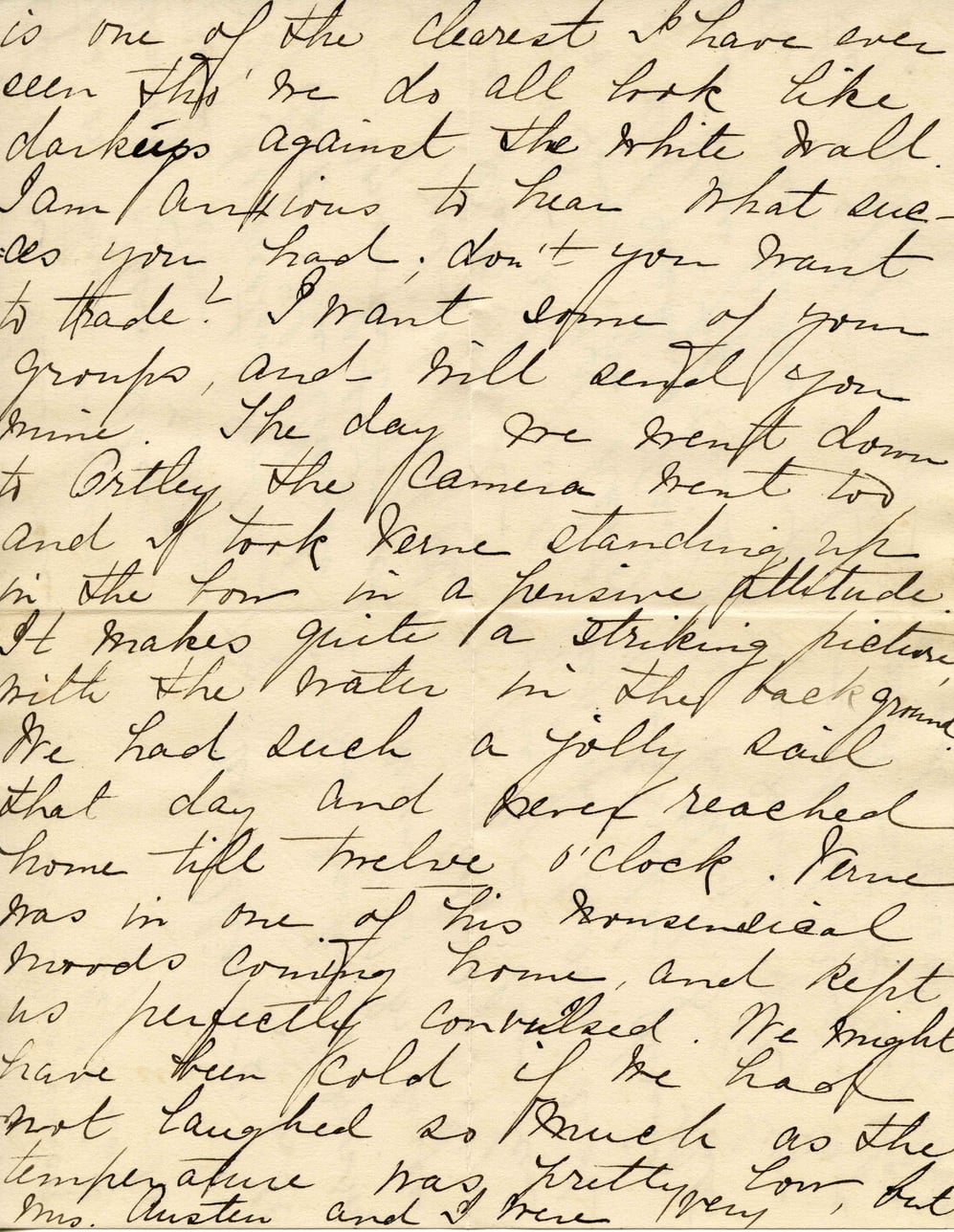 is one of the clearest I have ever seen & they do all look like darkings against the white wall. I am anxious to hear what successes you had; don't you want to trade? I want some of your groups, and will send you mine. The day we went down to Orley the camera went to and I took Irene standing up in the bow in a pensive attitude. It makes quite a striking picture with the water in the background. We had such a jolly sail that day and never reached home till twelve o'clock. Irene was in one of his nonsensical moods coming home, and kept us perfectly convulsed. We might have been cold if he had not laughed so much as the temperature was pretty low, but Mrs. Austen and I were