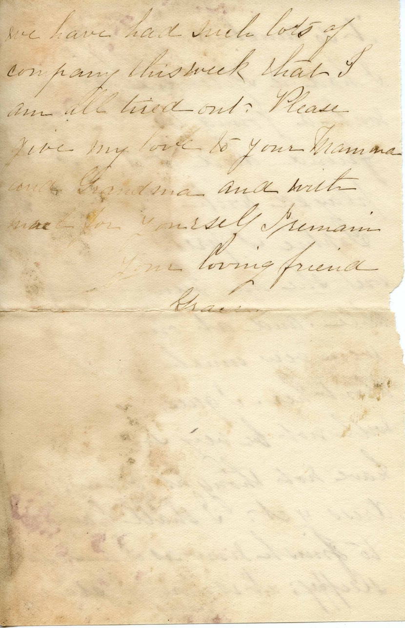 we have had such lots of company this week that I am all tired out. Please give my love to your Gramma and Grandma and write me for yourself & remain Your loving friend Grace