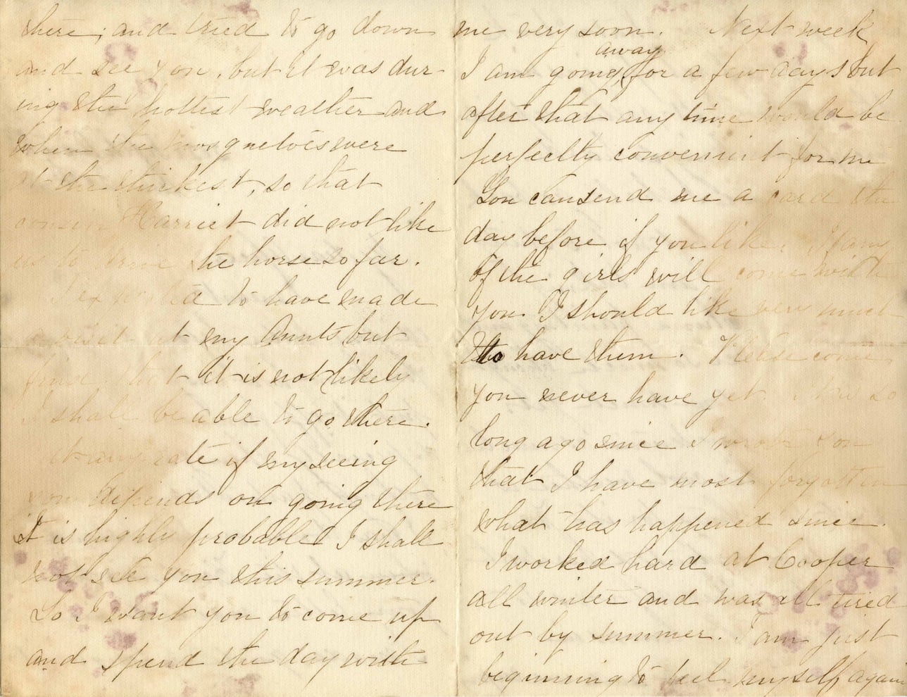 there; and tried to go down and see you, but it was during the hottest weather and when the magnolias were at their richest, so that even Harriet did not like us to drive the horse so far. I expected to have made a visit to my Aunts but fear that it is not likely I shall be able to go there. At any rate if bicycling ever depends on going there it is highly probable I shall not see you this summer. So I want you to come up and spend the day with me very soon. Next week away I am going for a few days but after that any time would be perfectly convenient for me. You can send me a card the day before, if you like. If any of the girls will come with you, I should like very much to have them. Please come, you never have yet. It has been so long ago since I wrote you that I have most forgotten what has happened since. I worked hard at Cooper all winter and was all tired out by summer. I am just beginning to feel myself again.