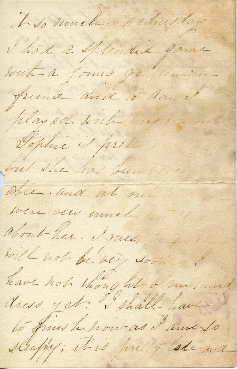 It so much. Wednesday I had a splendid game with a young gentleman friend and to-day I played with him too. Sophie is pretty, nice, &c., but she has been troublesome, and at one time we were very much bewildered about her. I guess her questions will not be very soon. I have not thought of my maid's dress yet. I shall have to finish now as I am so sleepy; it is pretty late and