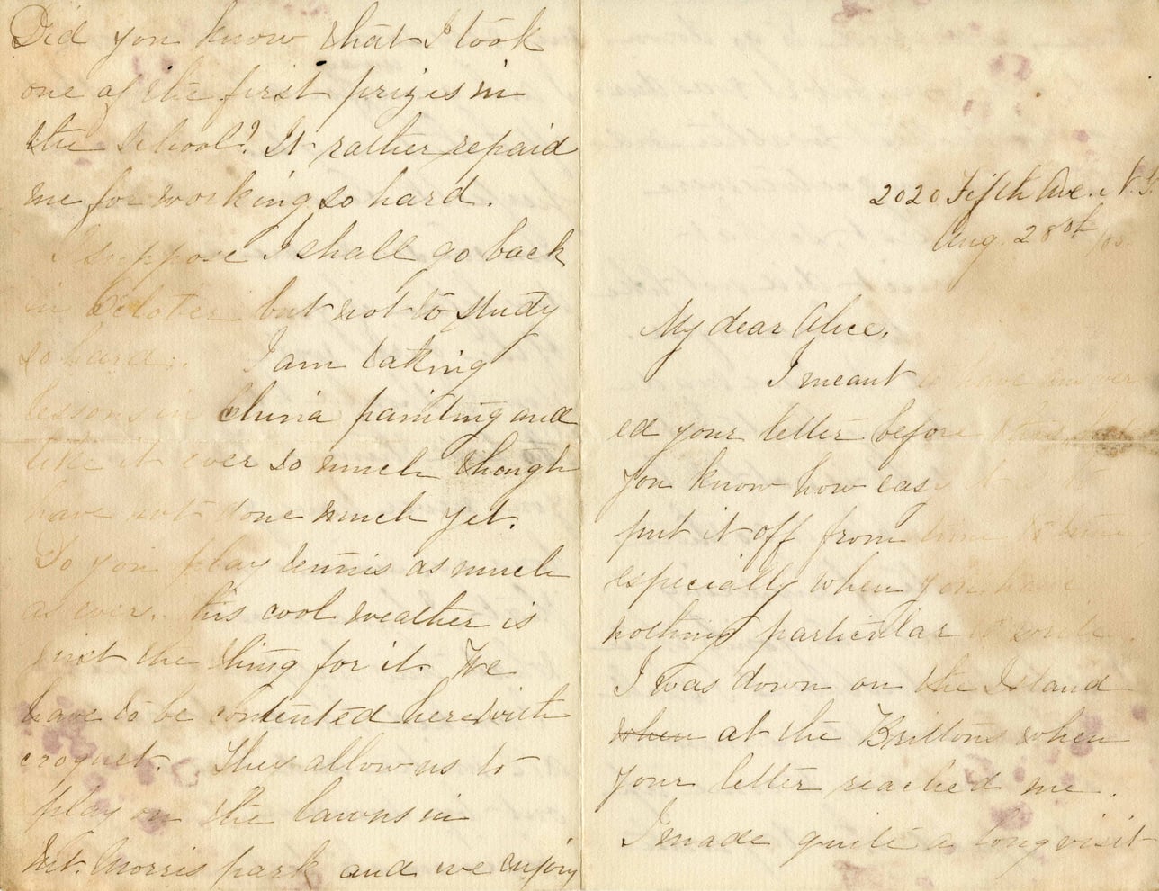 @file_pinax -> metadata -> @grace_simonson:person {role: "creator of letters"}Did you know that I took one of the first prizes in the school? It rather repaid me for working so hard. I suppose I shall go back in October but not to study so hard. I am taking lessons in China painting and like it ever so much though have not done much yet. So you play tennis as much as ever. This cool weather is just the thing for it. We love to be celebrated here with croquet. They allow us to play on the lawns in Mr. Morris park and we enjoy My dear Alice, I meant to have answered your letter before, you know how easy it is to put it off from time to time especially when you have nothing particular to write. I was down on the Island when at the Buttons when your letter reached me. I made quite a long visit.