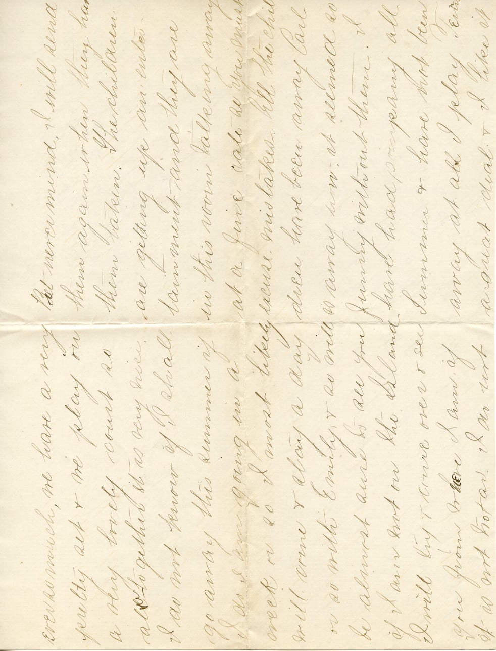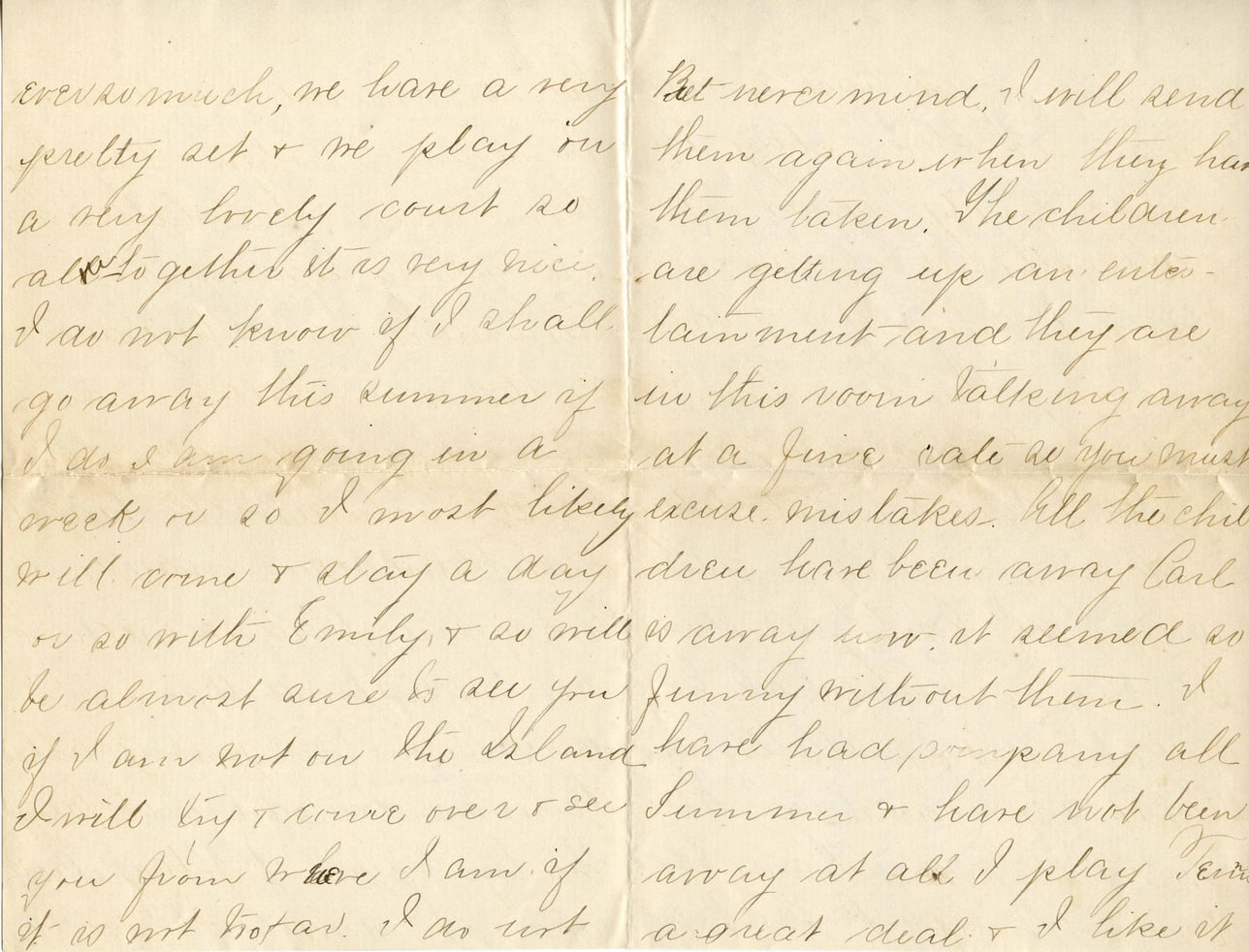 Even so much, we have a very pretty act & we play on a very lovely court so altogether it is very nice. I do not know if I shall go away this summer if I do I am going in a week or so I most likely will come & stay a day or so with Emily, & as will be almost sure to all you if I am not on the Island I will try to come over & see you from where I am if it is not too far. I do not but never mind, I will send them again when they have taken. The children are getting up an entertainment and they are in this room talking away at a juice rate as you must see with Emily without them. I have had company all Summer & have not been away at all I play Tennis a great deal & I like it