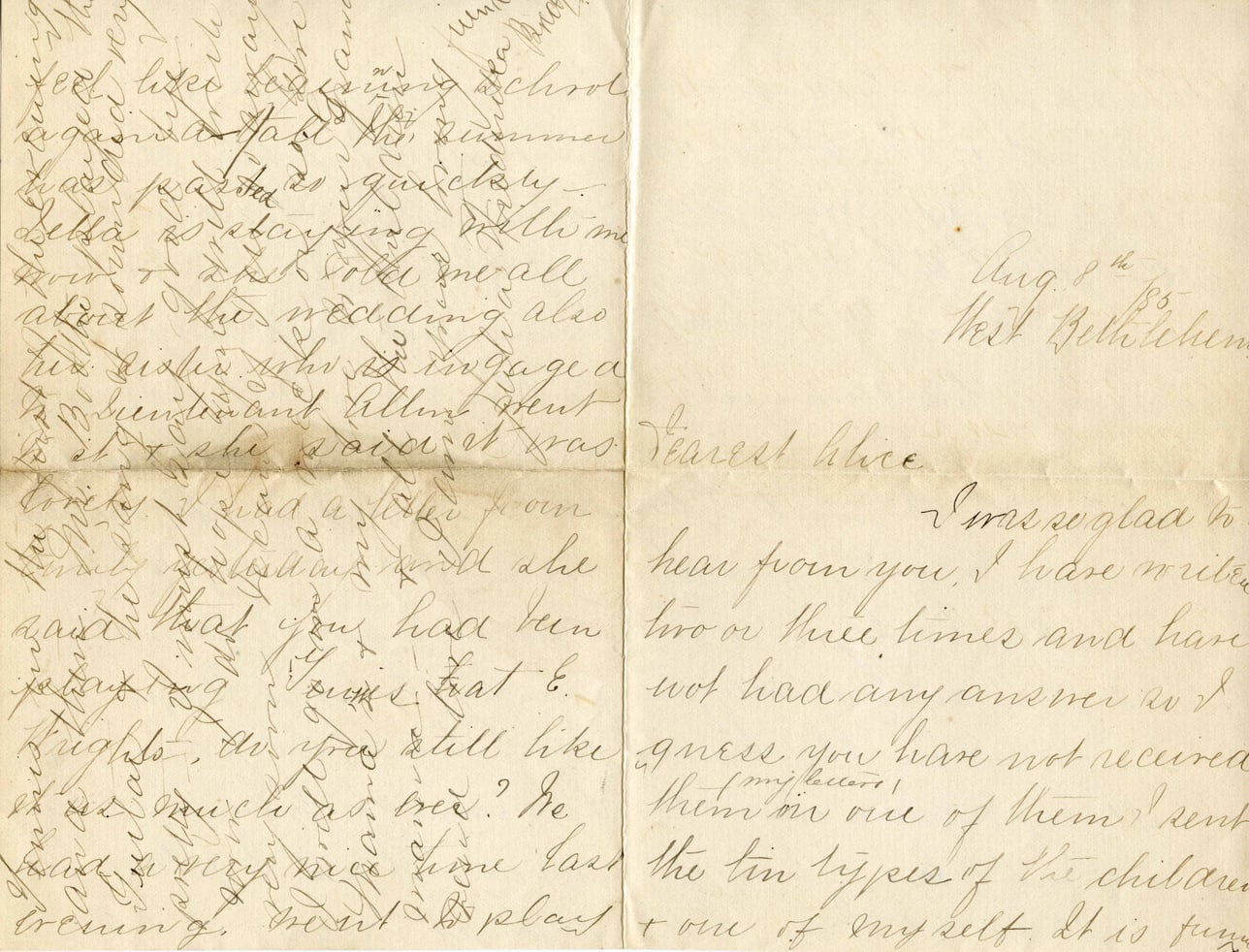 @alice_austen_correspondence -> contains -> @letter_1850_08_09_julia_bredtAug 8th 1855 West Bethlehem Dearest Alice, I was so glad to hear from you. I have written two or three times and have not had any answer so I guess you have not received them nor one of them. I sent the ten types of the children & one of myself. It is fun.