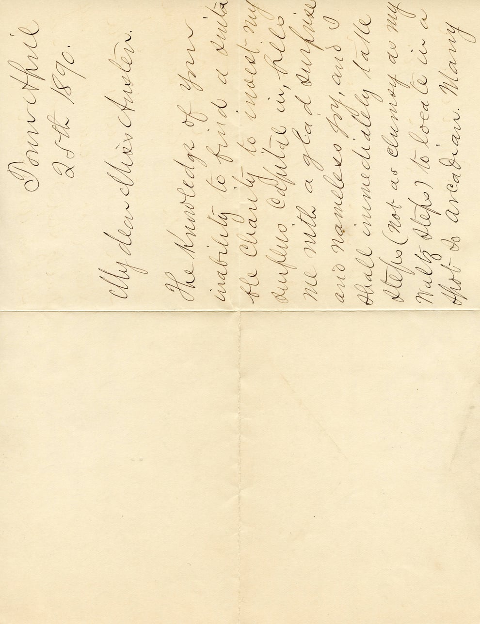 Doworthrie 25th 1890. My dear little sister, The knowledge of your inability to find a suitable site charity to invest my surplus capital in, fills me with a glad surprise and nameless joy, and I shall immediately take steps (not as clumsy as my mother's steps) to locate in a short-to-arcadian. Many
