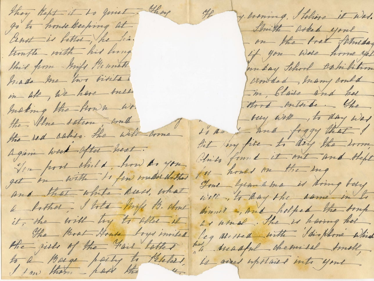 They kept it so quiet. They go to housekeeping at Ernest is better, she has trouble with his lung this from Miss Hennett made me two visits in all, we have been making the show for the blue section and the red ashes. She will come again week after next. Your poor child, how do you get on with so few underclothes and that white dress, what a bother. I told Miss K. about it, she will try to alter it. The Post House boys invited the girls of the Fair Ladies to a Mage party to Petchers, I saw them past the evening. I believe it was. Smith asked you on the first Saturday if you were home yet Sunday School Exhibition crowded, many could in, Claire and her Wood outside. She very well, today was so am and foggy that I lit my fire to dry the room, Chris found it out and help for hours on the rug. Your Gramma is doing very well, today she came in to dinner, and helped the soup as usual. She is having her leg dressed with 'disphonic' which has a dreadful chemical smell, is added upstairs into your