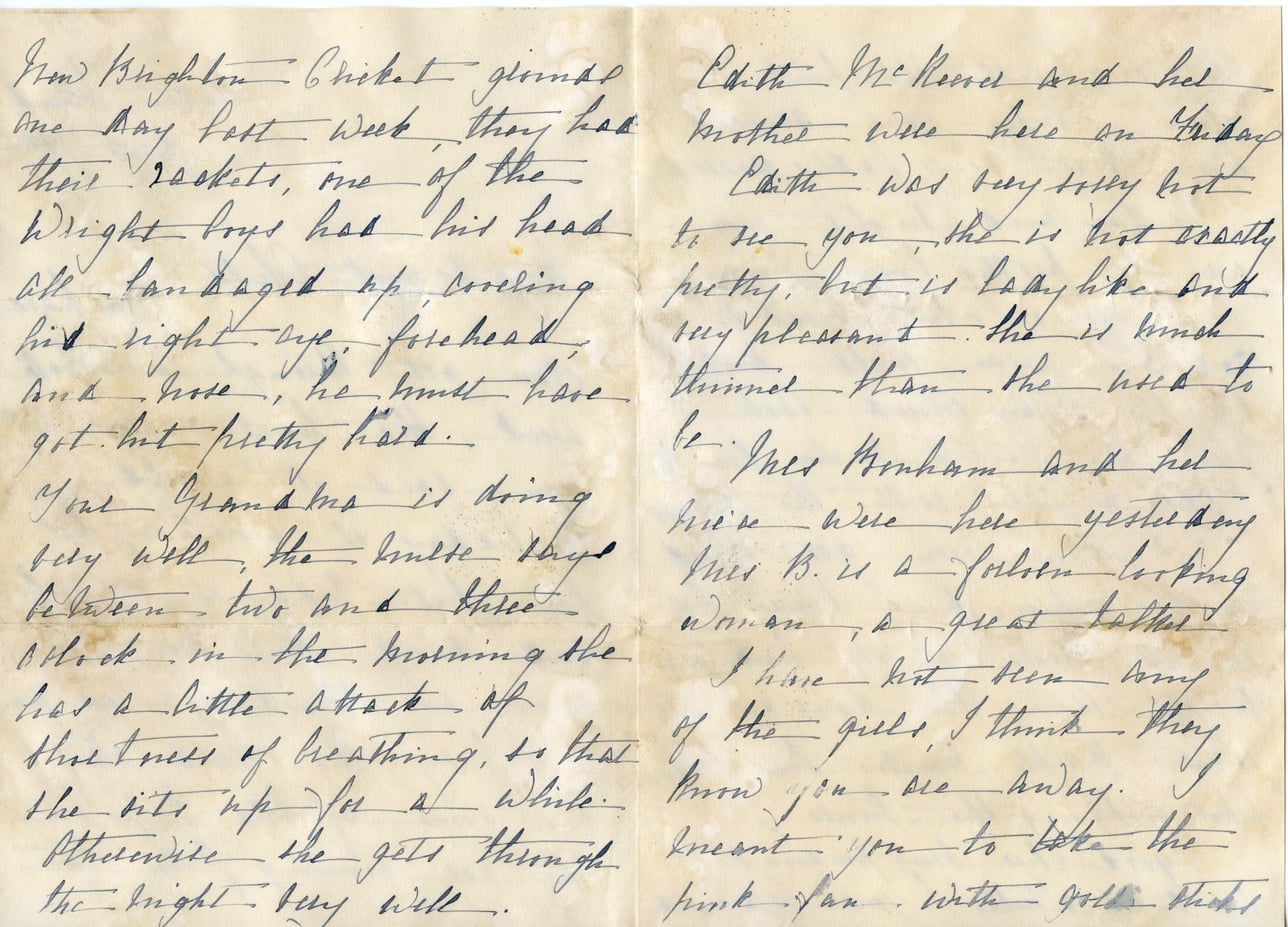 From Brighton Cricket grounds one day last week, they had their 2s. tickets, one of the Wright boys had hit his head all bandaged up, swelling his right eye, forehead, and nose, he must have got hit pretty hard. Your Grandma is doing very well, she must stay between two and three o'clock in the morning, she has a little attack of shortness of breathing, so that she sits up for a while. Otherwise she gets through the night very well. Edith McReese and her brother were here on Friday. Edith was very sorry not to see you, she is not exactly pretty, but is ladylike and very pleasant. She is much thinner than she used to be. Miss Monham and her niece were here yesterday. Miss B. is a fiddler-looking woman, a great lassie! I have not seen any of the girls, I think. They know you are away. I meant you to take the pink fan with gold tassels.