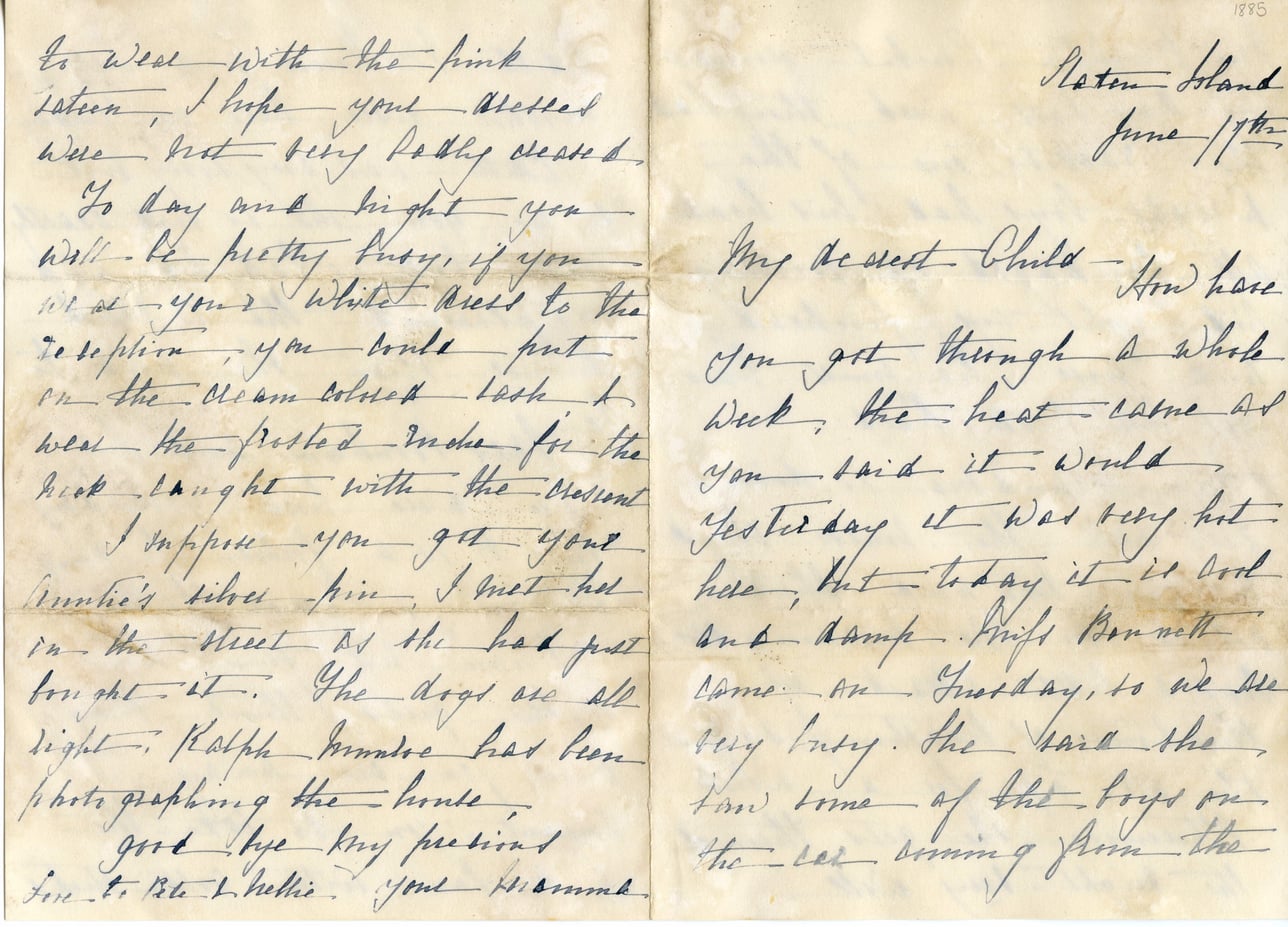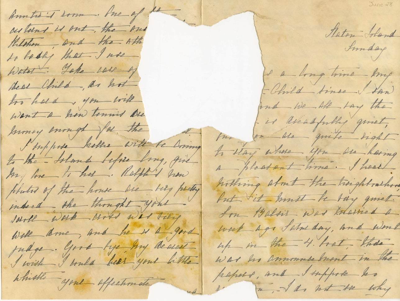 Auntie's room. One of us is out, the one kitchen, and the other so busy that I see water. Take care of those child, as not too hard, you will want a new tennis ace money enough for the. I suppose Helen will be coming to the Island before long, give my love to her. Ralph's new photos of the house are very pretty indeed. She thought you would work. Ossie was very well done, and he is a good judge. Goodbye, my dearest. I wish I could hear your little whistle. Your affectionate, June 28 Staten Island Sunday It's a long time since I saw child since I saw and we all say the is dreadfully quiet, you or she quite right to stay where you are having a pleasant time. I heard nothing about the brightoners, but it must be very quiet. Lon Balser was married a week ago Saturday, and won't up in the 4. frat. There was no announcement in the papers, and I suppose so soon, I do not see why