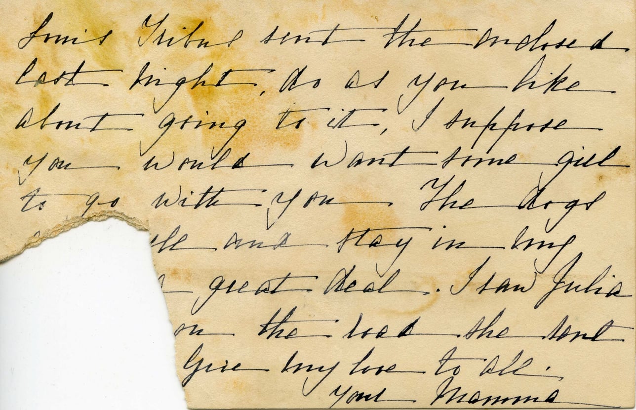 @momma -> mentioned -> @ralph_monroeLouis Yulins sent the enclosed last night, as as you like about going to it, I suppose you would want some girl to go with you. The dogs ill and stay in long great deal. I saw Julia's on the list she don't give my love to all. Yours, Momma