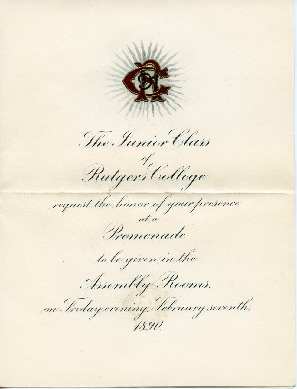 The Junior Class of Rutgers College request the honor of your presence at a Promenade to be given in the Assembly Rooms on Friday evening, February seventh, 1890.
