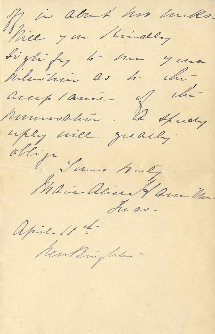 Be in about two weeks. Will you kindly signify to me your intention as to the acceptance of the invitation. A speedy reply will greatly oblige. I am truly, Marie Alice Hamilton Mass. April 11th: Kent Brighton