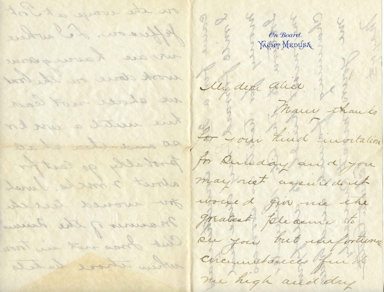 On Board. Yacht Medusa My dear Alice, Many thanks for your kind invitation for Sunday and you may rest assured it would give me the greatest pleasure to see you but unfortunate circumstances find me high and dry.