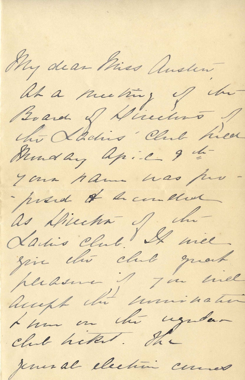 @esther_lester -> requested -> @lawn_club {payment: "dues and money for tickets", date: @date_1888_05_06}My dear Miss Austen, At a meeting of the Board of Directors of the Ladies' Club held Sunday April 9th, your name was proposed & accepted as Director of the Ladies Club. It will give the club great pleasure if you will accept the nomination to serve on the regular club ticket. The general election comes