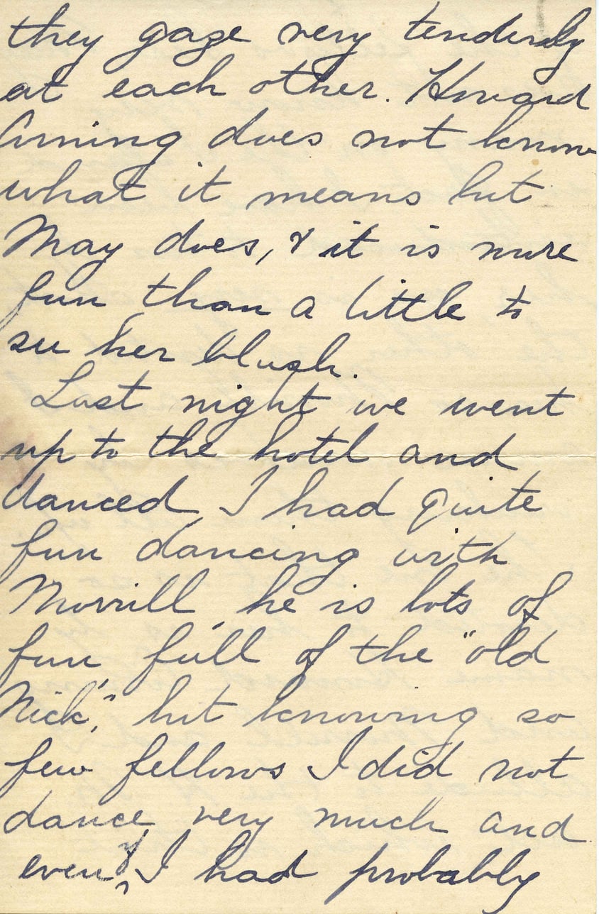 they gaze very tenderly at each other. Howard Loring does not know what it means but May does, & it is more fun than a little to see her blush. Last night we went up to the hotel and danced. I had quite fun dancing with Morill he is lots of fun full of the "old Nick," but knowing so few fellows I did not dance very much and even I had probably