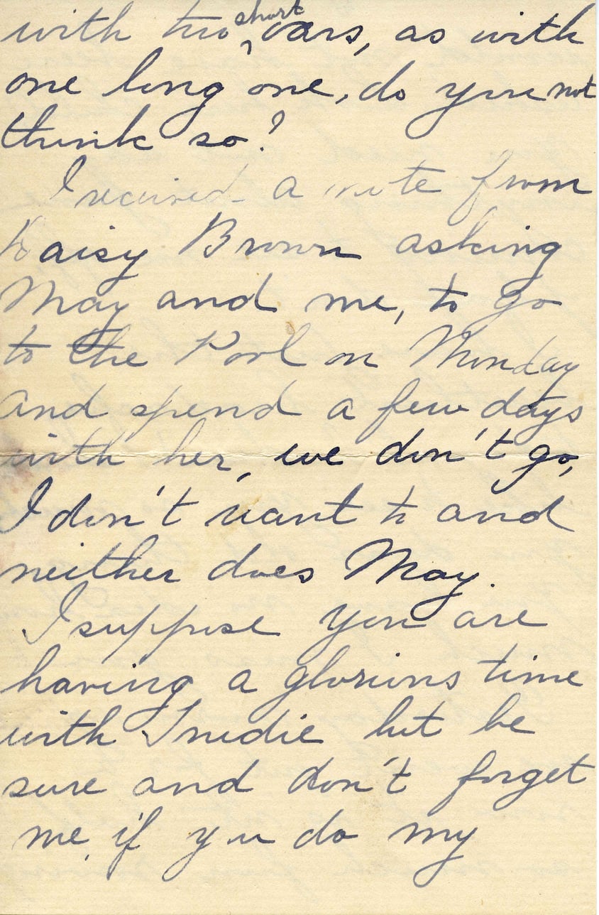with two short cars, as with one long one, do you not think so? I received a note from Daisy Brown asking May and me to go to the Pool on Monday and spend a few days with her. We don't go; I don't want to and neither does May. I suppose you are having a glorious time with Freddie but be sure and don't forget me if you do my