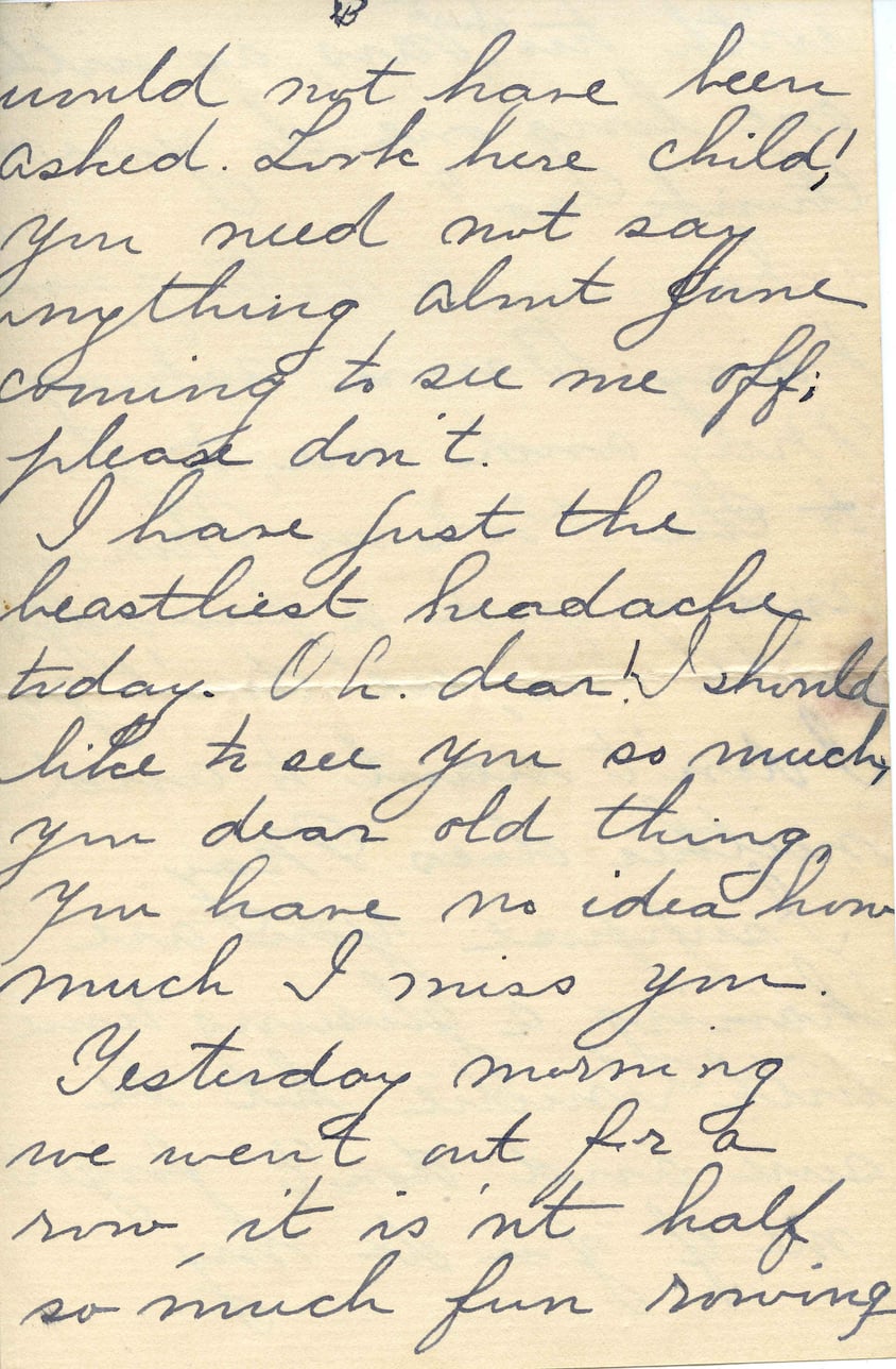 would not have been asked. Look here child! You need not say anything about June coming to see me off; please don't. I have just the beastliest headache today. Oh dear! I should like to see you so much, you dear old thing. You have no idea how much I miss you. Yesterday morning we went out for a row, it isn't half so much fun rowing