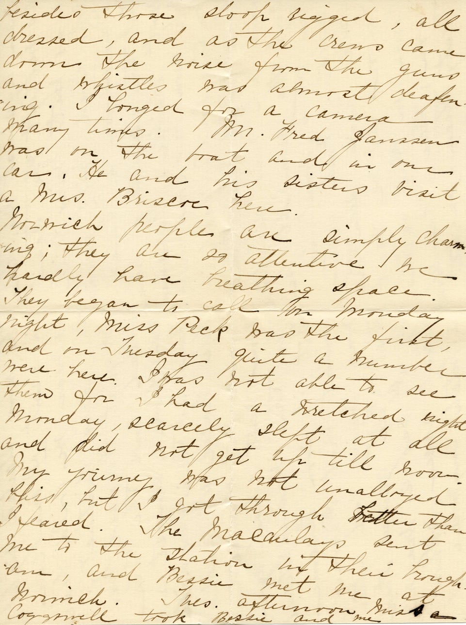 resided those sloops rigged, all dressed, and as the crew came down the noise from the guns and whistles was almost deafening. I longed for a camera many times. Mr. Fred Janssen was on the boat and in our car. He and his sisters visit Mrs. Briscoe here. Norwich people are simply charming; they are so attentive we hardly have breathing space. They began to call on Monday night, Miss Peck was the first, and on Tuesday quite a number were here. I was not able to see them for Monday, scarcely slept at all and did not get up till noon. My journey was not unalloyed this, but I got through better than I feared. The Macaulays sent me to the Station by their coachman, and Bessie met me at Norwich. Mrs. Cogswell took Bessie and me