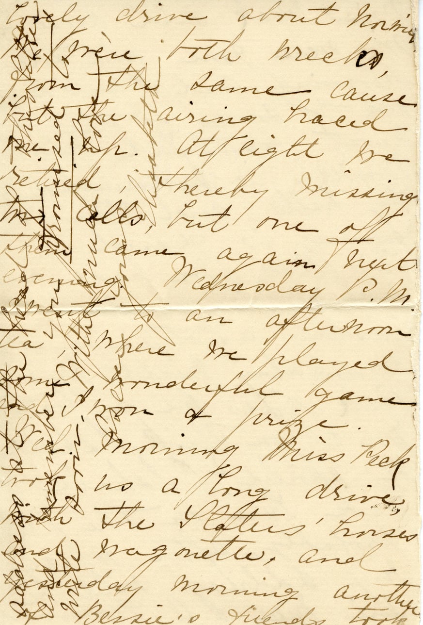 lovely drive about home from the 10th week, from the same cause into the airing traced her. At eight we retired thereby missing Collo, but one of them came again that evening. Wednesday P.M. an afternoon where we played wonderful game for a prize. Morning Miss Beck has a long drive, the States' horses wagonette, and yesterday morning another Bessie's friends took