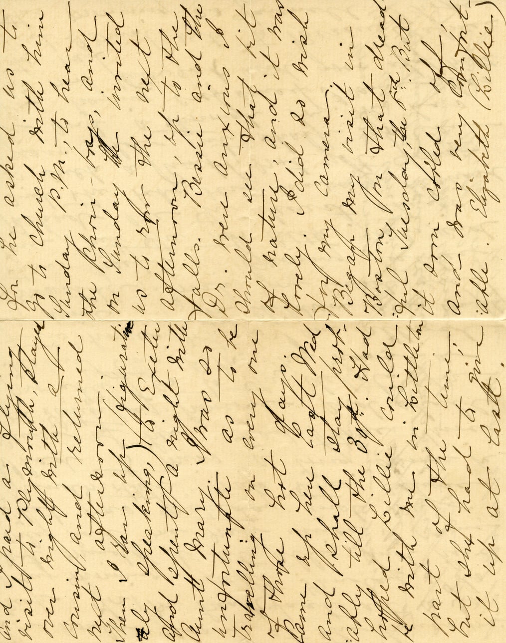 @letter_1890_july_3004:document {date: @date_1890_07, sender: @bessie_strong, recipient: @alice_austen, source_file: @file_1890_july_3004_bessie_strong_jpg, content_summary: "Visit to Plymouth, church funeral, camera, daughter Elizabeth"}