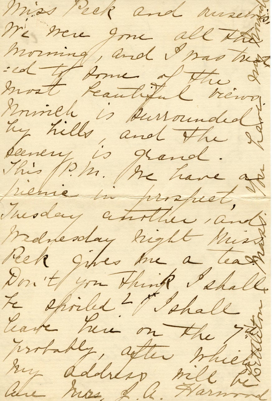 Miss Peck and ourselves were gone all the morning, and I was treated to some of the most beautiful views. Norwich is surrounded by hills, and the scenery is grand. This P.M. we have a picnic in prospect, Tuesday another, and Wednesday night Miss Peck gives me a tea. Don't you think I shall be spoiled? I shall leave here on the 7th probably, after which my address will be Mrs. L.A. Harwood