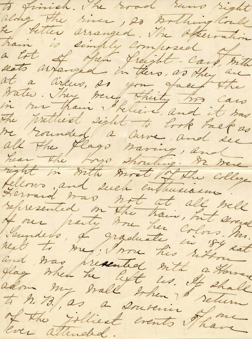 to finish. The road runs right along the river, so nothing could be better arranged. The observation train is simply composed of a lot of open freight-cars, with seats arranged in them, as they are at a circus, so you face the water. They were thirty-two cars in our train I believe, and it was the prettiest sight to look back as we rounded a curve, and see all the flags waving, and hear the boys shouting. We were right in with most of the college fellows, and such enthusiasm. Harvard was not at all well represented on the train, but several of our party bore her colors. Mr. Saunders, a graduate in '84 sat next to me; I wore his ribbon and was presented with a Harvard flag when he left us. It shall adorn my wall when I return to G.B., as a souvenir of one of the jolliest events I have ever attended.