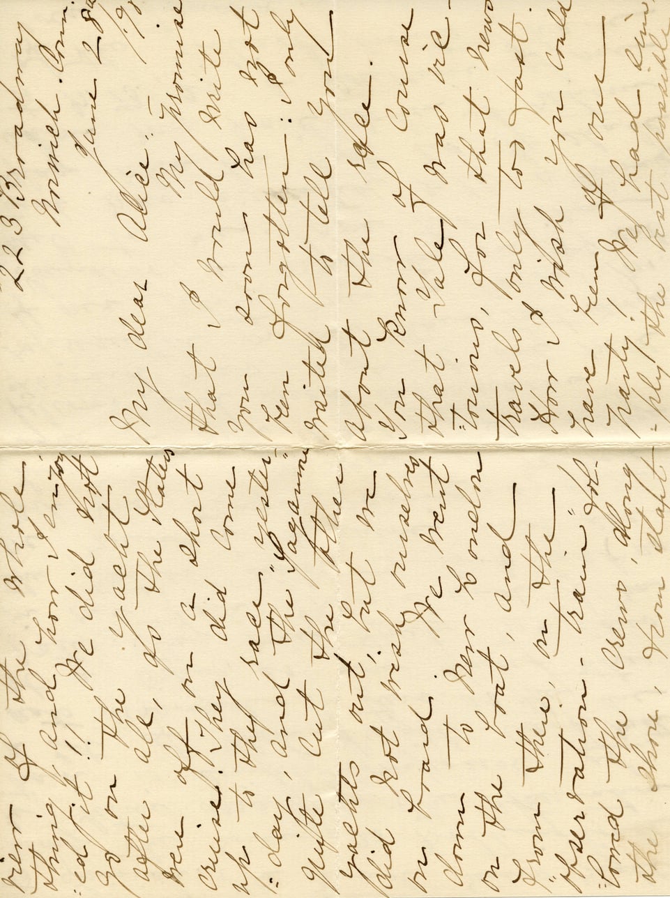 @letter_1890_june_1002:document {date: @date_1890_06, sender: @bessie_strong, recipient: @alice_austen, source_file: @file_1890_june_1002_bessie_strong_jpg, content_summary: "Travel narrative: cruise, Yale party, New London, Kent, train observations"}