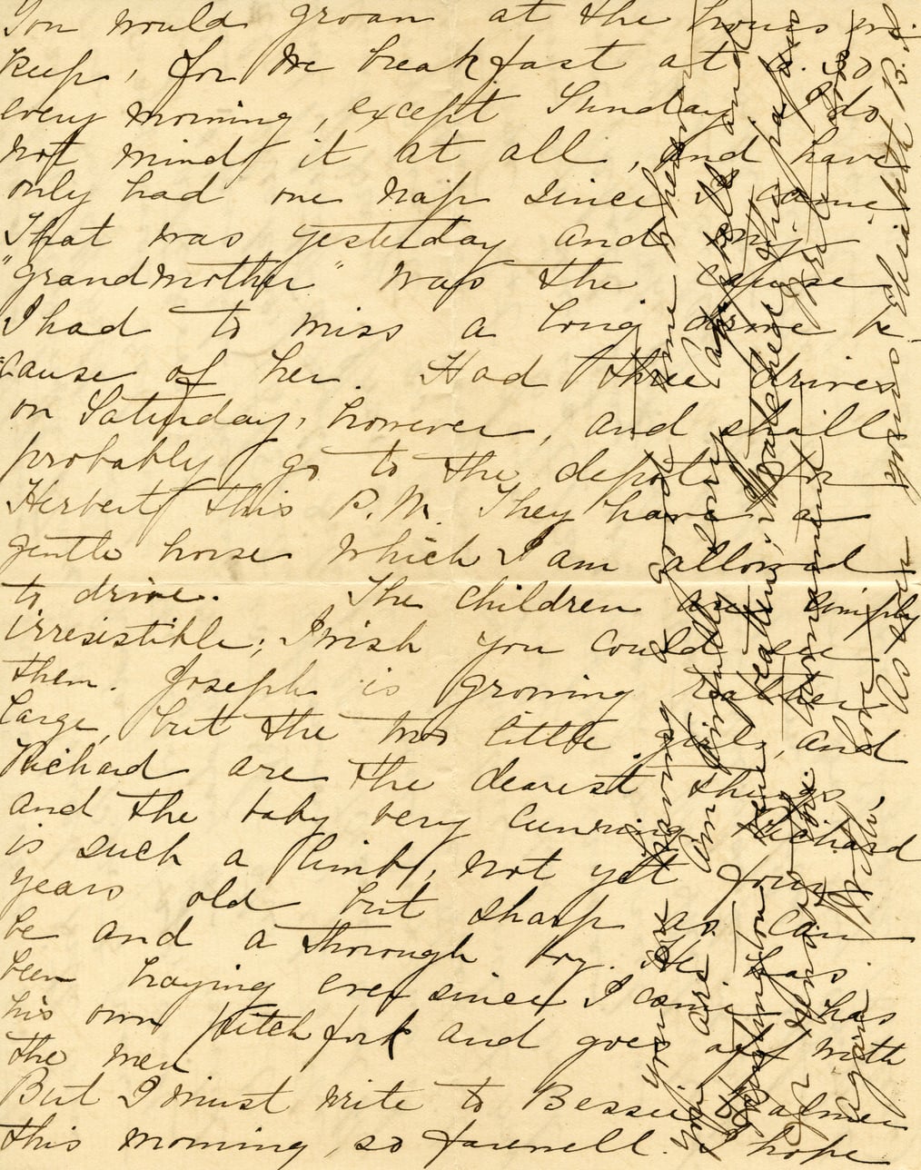 You would groan at the house keep, for breakfast at 8.30 every morning, except Sunday I do not mind it at all, and have only had one nap since it came. That was yesterday and the "grandmother" was the cause of her. Had three drives on Saturday, however, and shall probably go to the depot of Herbert this P.M. They have a gentle horse which I am allowed to drive. The children simply irresistible; wish you could see them. Joseph is growing large, but the two little girls, and Richard are the dearest things, and the baby very cunning. Richard is such a think, not yet three years old but sharp and a thorough boy. He has been having eref since I came, he has his own pitchfork and goes out with the milk. But I must write to Bessie this morning, so farewell.